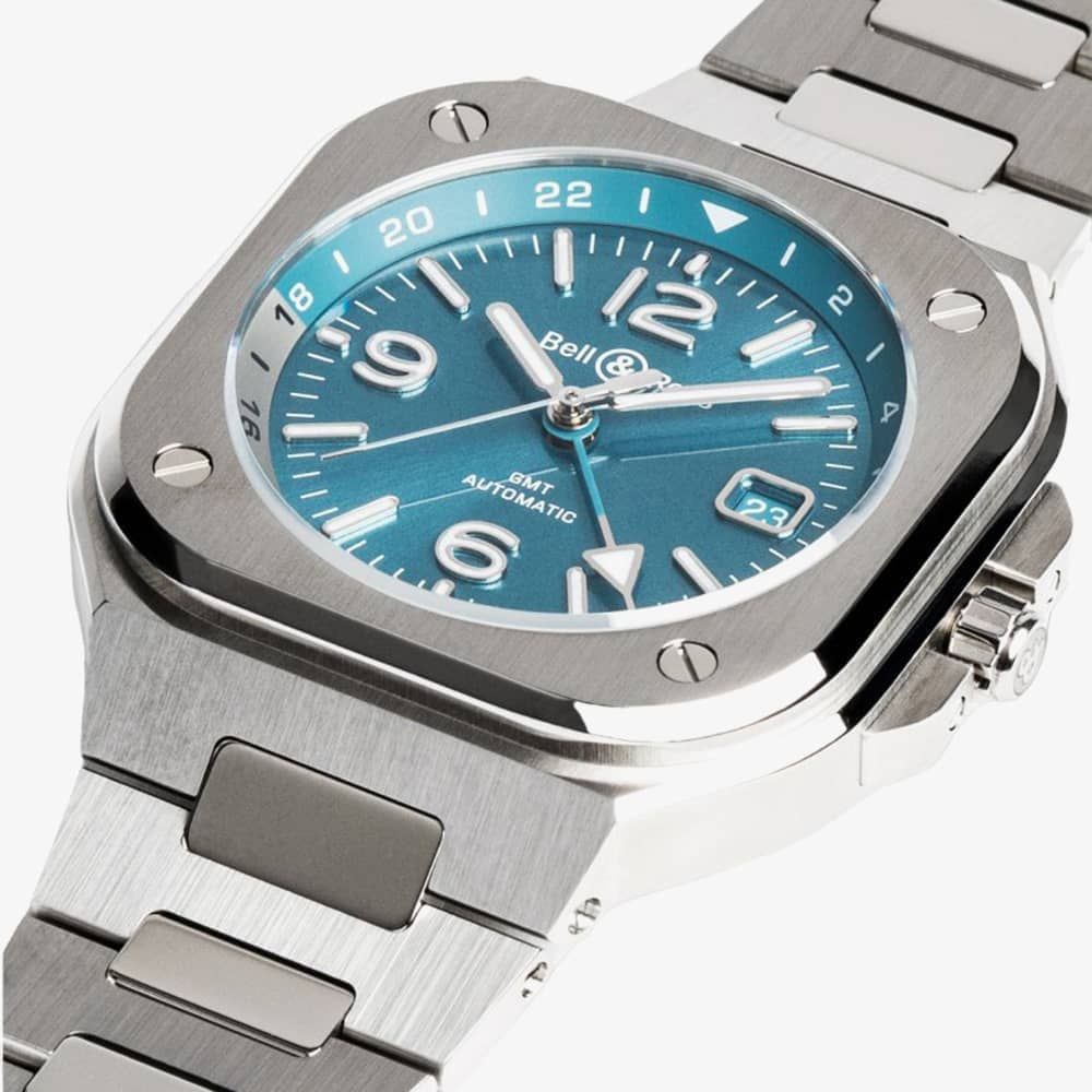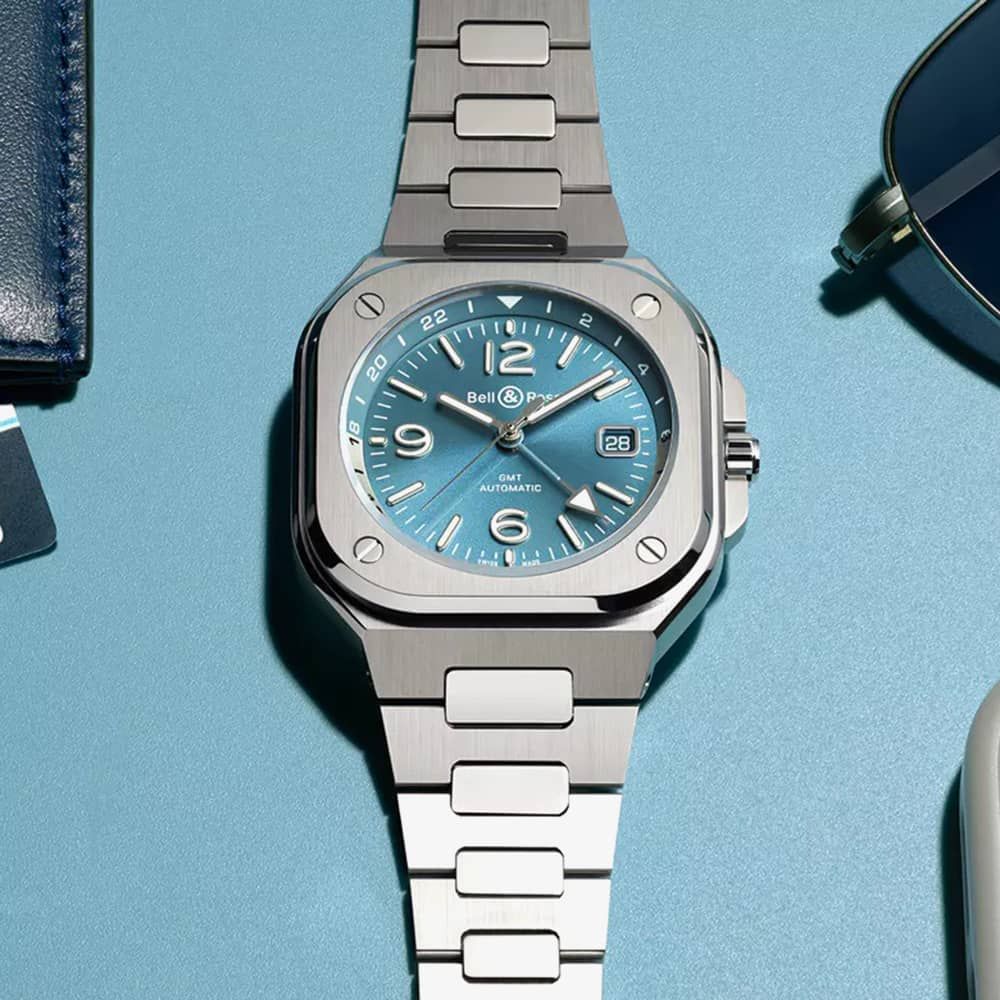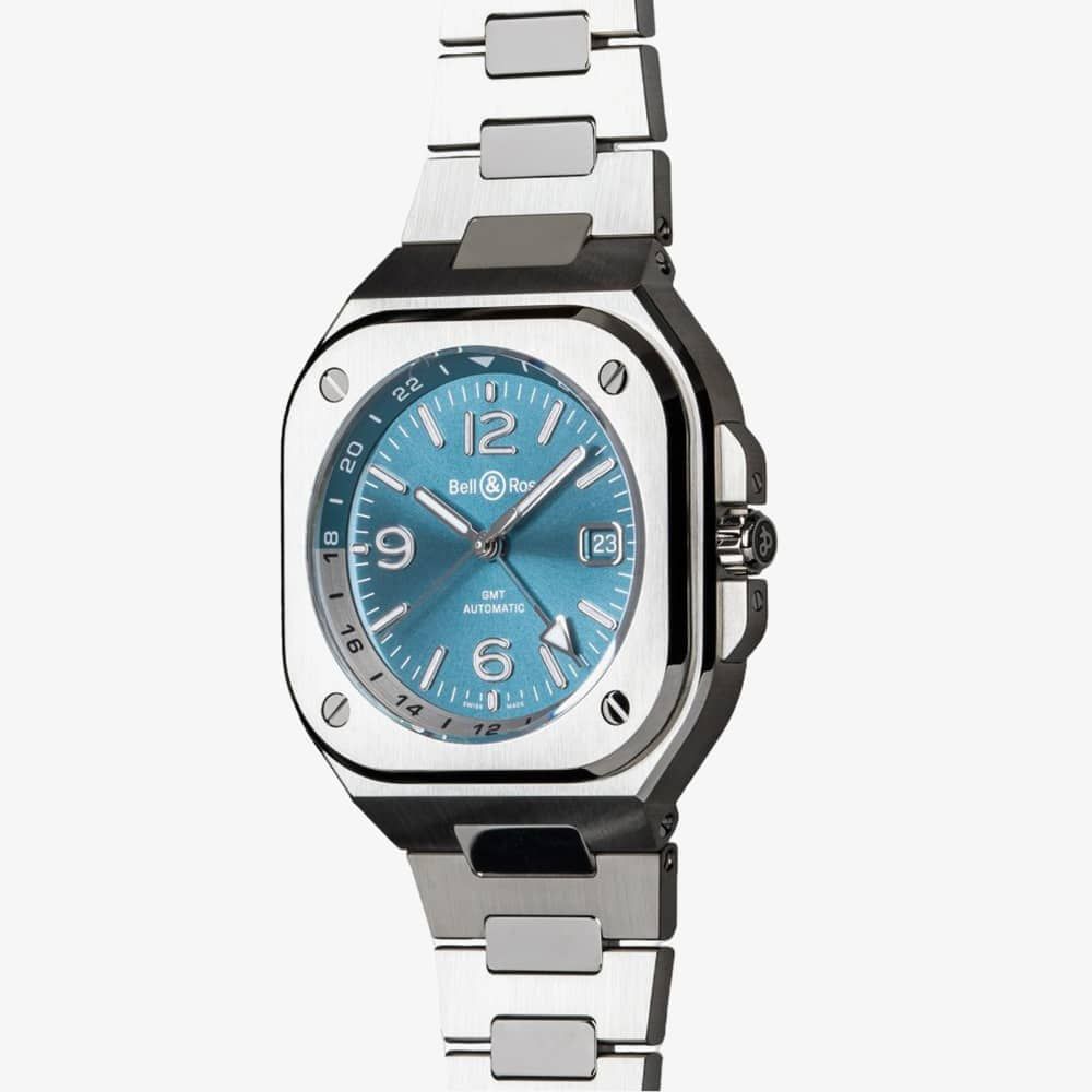 The BR 05 GMT Sky Blue showcases a captivating blue sunray dial with a convenient and uncomplicated second time zone indicated by an additional hand. Drawing inspiration from in-flight instruments, the BR 05 belongs to a collection of watches with a seamlessly integrated bracelet that blends harmoniously with the case. The GMT complication enhances practicality for travellers by offering information on a secondary time zone. The hand representing the second time zone completes a full revolution on the dial every 24 hours and is positioned alongside a 24-hour scale on the flange ring. The scale employs two distinct colours: grey for daytime (6 am to 6 pm) and blue for nighttime (6 pm to 6 am). To ensure excellent legibility, a broad arrow-shaped white tip promptly displays the time in the original country.