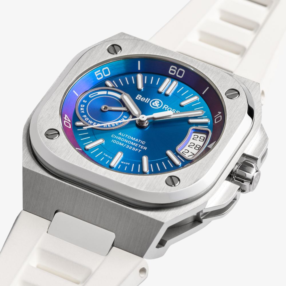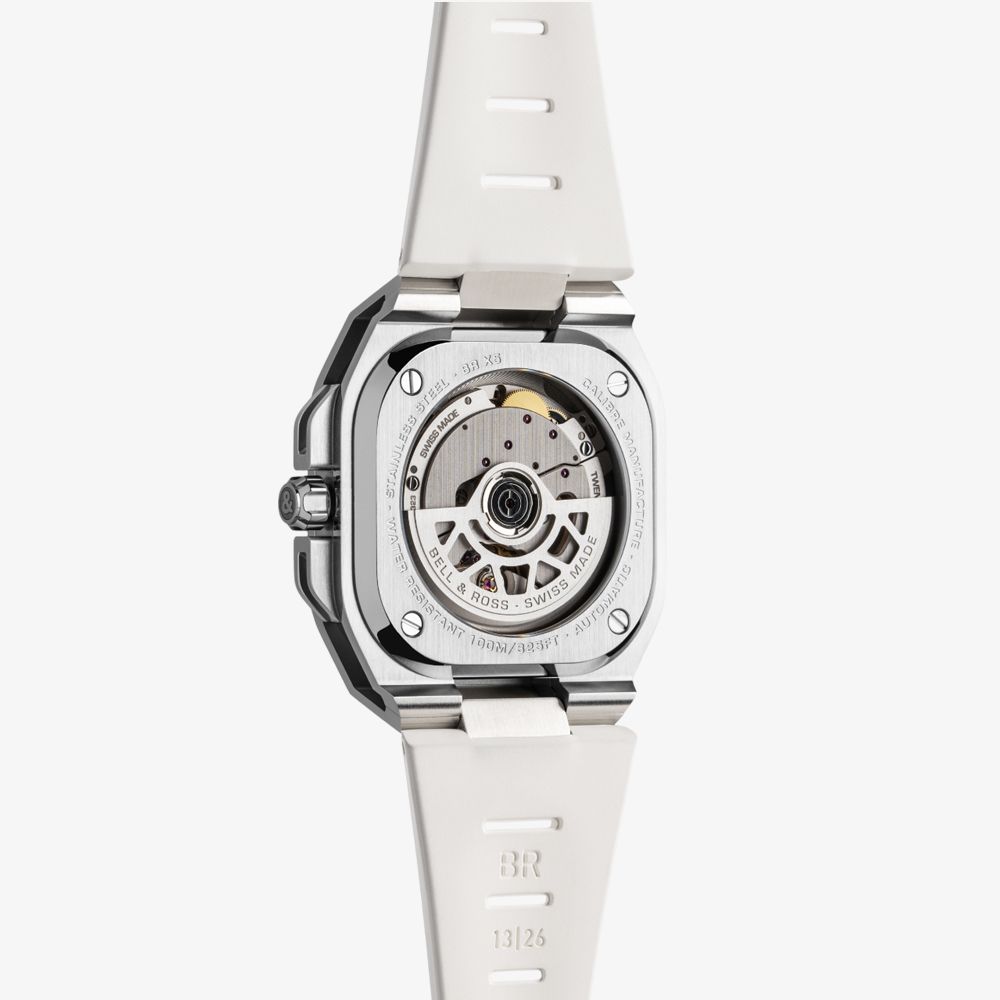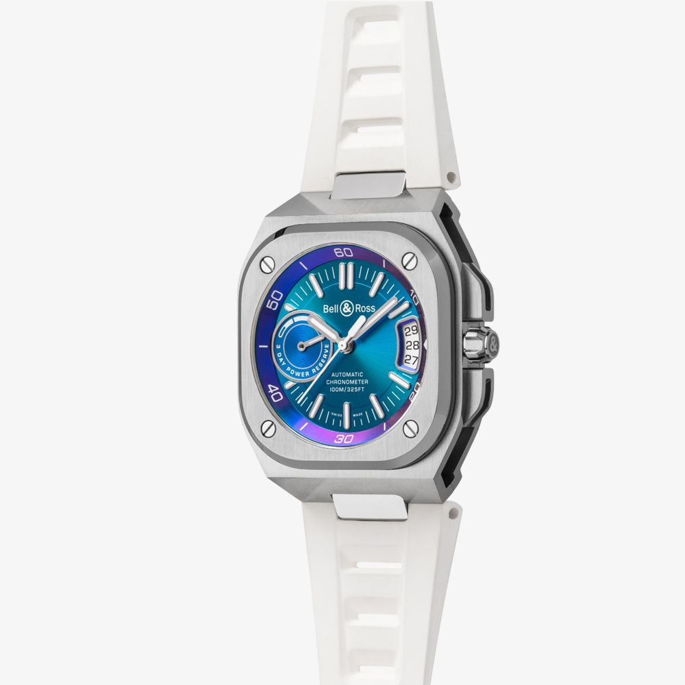 • 100 metre water resistance.Bell & Rosshttps://www.thbaker.co.uk/media/catalog/product/b/r/br-x5-iridescent-soldatwhitestrap_03.jpghttps://www.thbaker.co.uk/media/catalog/product/b/r/br-x5-iridescent-soldatwhitestrap_02.jpghttps://www.thbaker.co.uk/media/catalog/product/b/r/br-x5-iridescent-soldatwhitestrap_04.jpgadd-to-cartcondition:Nodisc_no_stock:Noex_display:Nosearch_keywords:waterproof,luxuryNoNoNowaterproof,luxuryBell & RossBRX5R-IRS-ST/SRBMensOfficial Bell & Ross Packaging2 Year Bell & Ross WarrantyClassicNoWatchSilverRubber StrapStainless SteelRound41.0mmAnalogueSapphire Crystal GlassBlueBlue100 metresAutomaticFold Over ClaspNo StoneNo StoneNoNoNoNoYesYesNo{"name":"v12_finance","text":"Or from \u00a3147 per month","imageUrl":"https:\/\/www.thbaker.co.uk\/media\/nosto\/v12-finance.png"}2499BRX5RIRSSTSRBBell & Ross Mens BR-X5 Iridescent White Rubber Strap Watch24-99-BRX5R-IRS-ST/SRB2025-05-28 00:00:000[{"path":"\/Watches","url":"\/watches\/"},{"path":"\/Watches\/Mens Watches","url":"\/mens-watches\/"},{"path":"\/Watches\/Automatic Watches","url":"\/automatic-watches\/"},{"path":"\/Watches\/Classic Watches","url":"\/classic-watches\/"},{"path":"\/Watches\/Swiss Watches","url":"\/swiss-watches\/"},{"path":"\/Brands A-Z\/Bell & Ross Watches","url":"\/bell-and-ross-watches\/"},{"path":"\/Watches\/Luxury Watches","url":"\/luxury-watches\/"},{"path":"\/Brands A-Z\/Bell & Ross Watches\/Bell & Ross Mens","url":"\/bell-ross-mens\/"},{"path":"\/Free Gift Card - When you spend \u00a3500+","url":"\/free-gift-card\/"},{"path":"\/Watches\/Luxury Watches\/Mens Luxury Watches","url":"\/mens-luxury-watches\/"},{"path":"\/\u00a3500 Gold Gift Card (\u00a35001+)","url":"\/500-gold-gift-card\/"},{"path":"\/Free Gift With Purchase Products","url":"\/free-gift-with-purchase-products\/"},{"path":"\/Watches\/Waterproof Watches","url":"\/waterproof-watches\/"},{"path":"\/Brands A-Z\/Bell & Ross Watches\/Bell & Ross Automatic","url":"\/bell-and-ross-automatic-watches\/"},{"path":"\/Brands A-Z\/Bell & Ross Watches\/Bell & Ross Strap","url":"\/bell-and-ross-strap-watches\/"}]2025-05-28