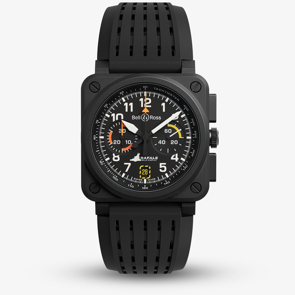 The BR-03 Chrono Rafale Solo Display pays tribute to the Rafale Solo Display team of the French Air and Space Force. Designed for extreme conditions, this limited-edition chronograph merges Bell & Ross’s aviation roots with military-grade performance. It features a Rafale jet silhouette, cockpit-inspired details like orange chronograph hands and a yellow-dotted date window, plus photoluminescent markers for low-light readability. It comes with two straps: a black openworked rubber and an ultra-resilient black synthetic fabric strap marked with the Rafale Solo Display logo.