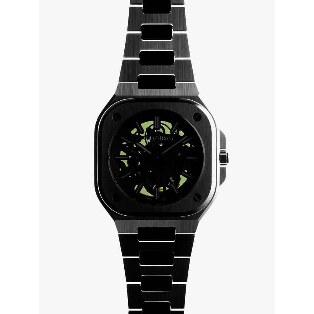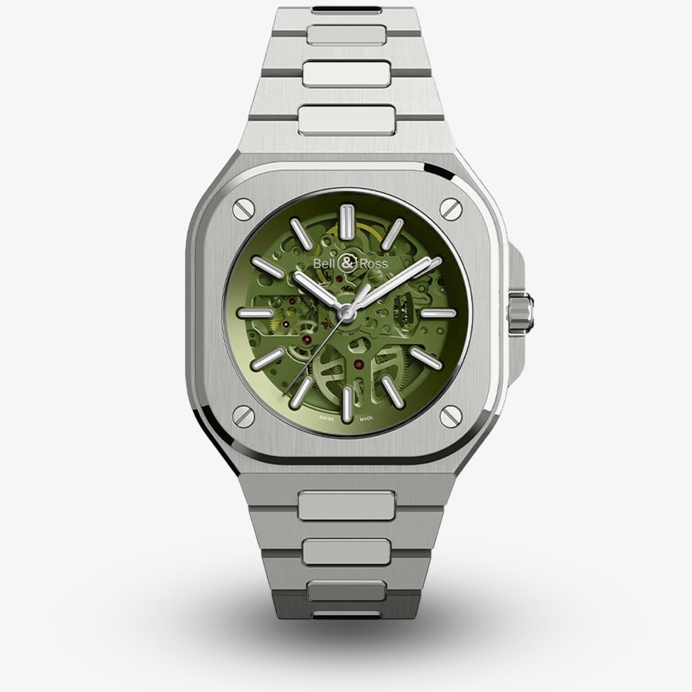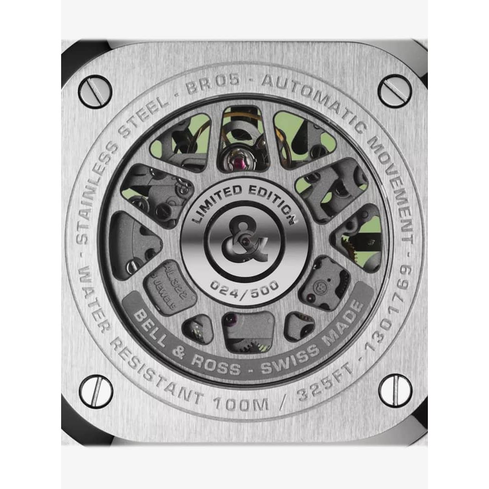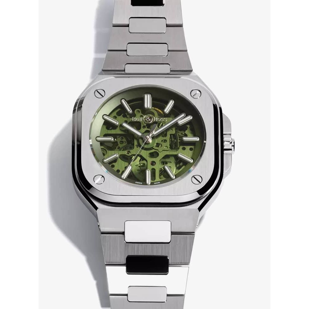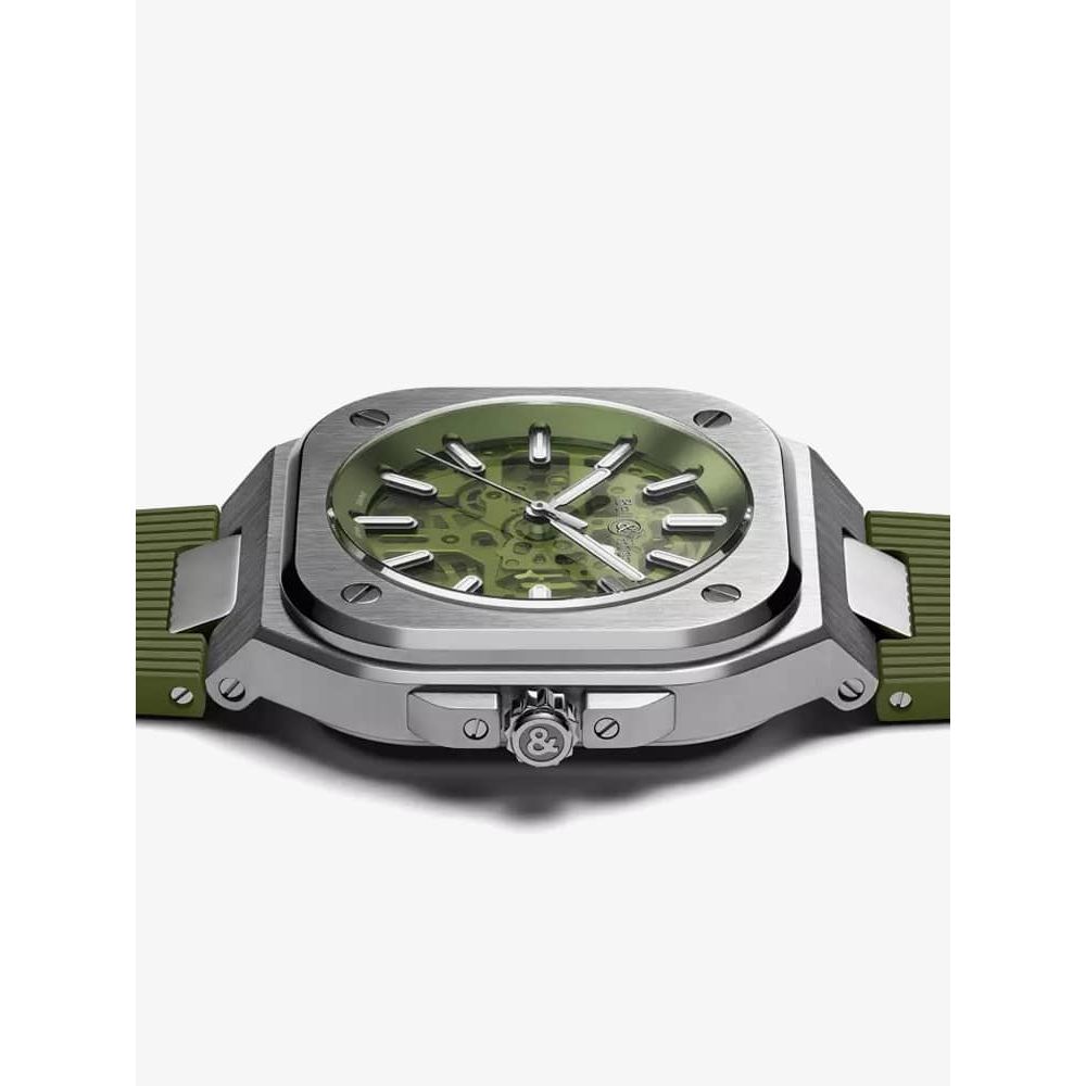 The Bell & Ross Limited Edition BR 05 Skeleton Watch BR05A-GN-SKST/SST combines a 40mm square-shaped polished stainless steel case and a silver polished stainless steel bracelet with a push button deployment clasp. It has a skeletonised olive green transparent analogue dial with Super-LumiNova luminescent hands and indexes, protected beneath scratch-resistant sapphire crystal glass with an anti-reflective coating. Power is generated by the self-winding automatic movement with an approximate power reserve of 38 hours. This model also has a water resistance of up to 100 metres. Limited Edition of 500 pieces.