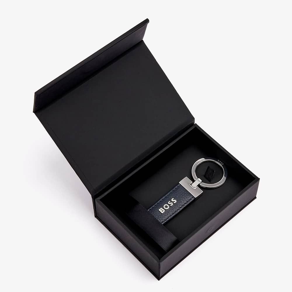 This elegant and timeless keyring is crafted from the same top-grain, matte-grained leather as the iconic small leather goods line. The sleek chrome metals are beautifully finished and feature an engraved BOSS logo.