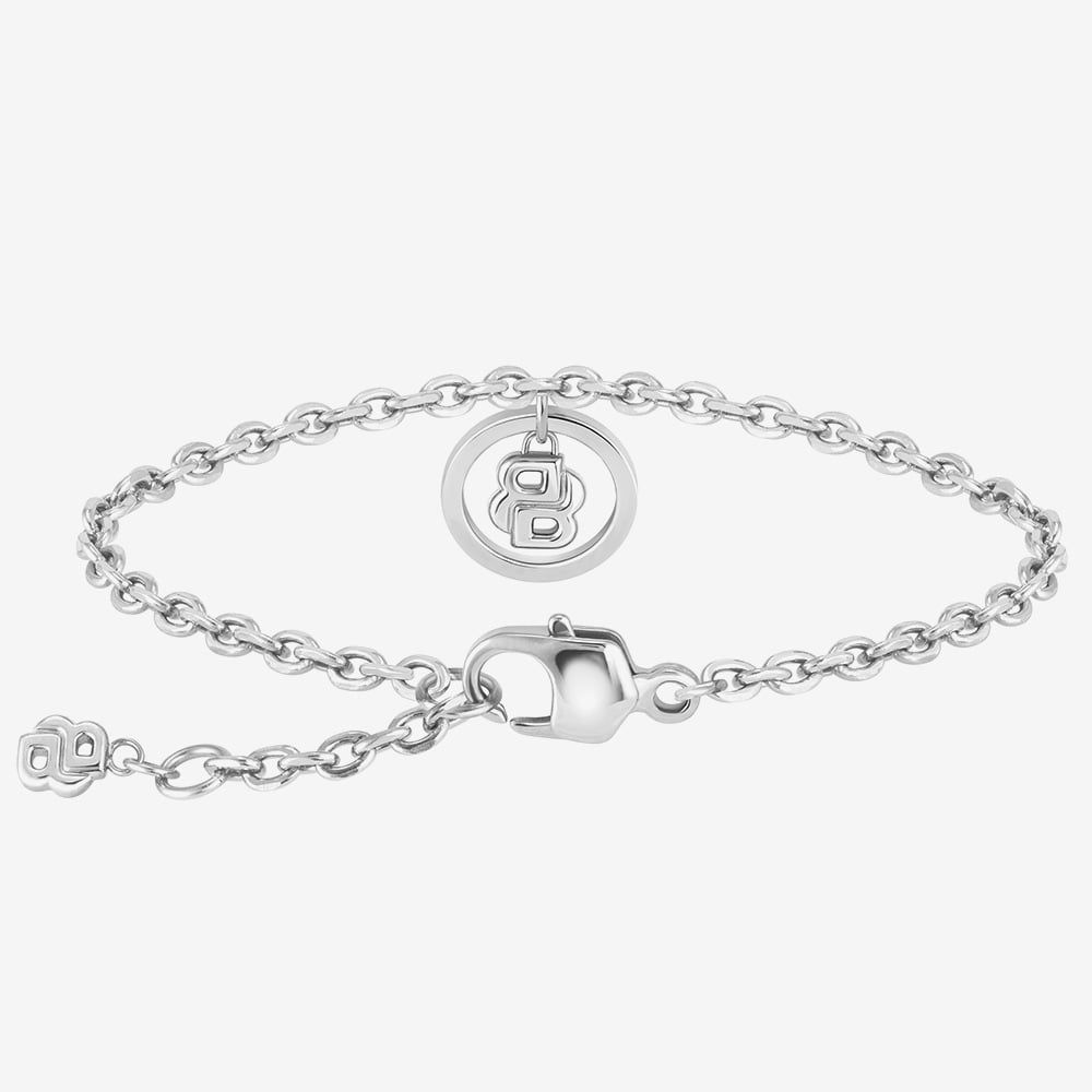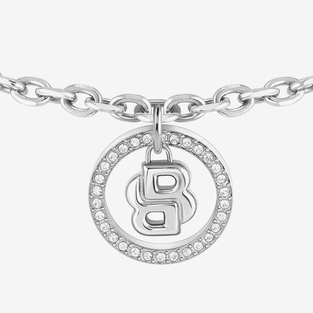 Sleek and contemporary, the BOSS Double B Divine Silver Tone Bracelet features a polished chain design highlighted by an open circle pendant adorned with shimmering white crystals and the iconic double B motif. Designed for a comfortable fit, it measures 16cm with a 2.5cm extender and is secured with a lobster clasp, making it a refined accessory for everyday elegance.