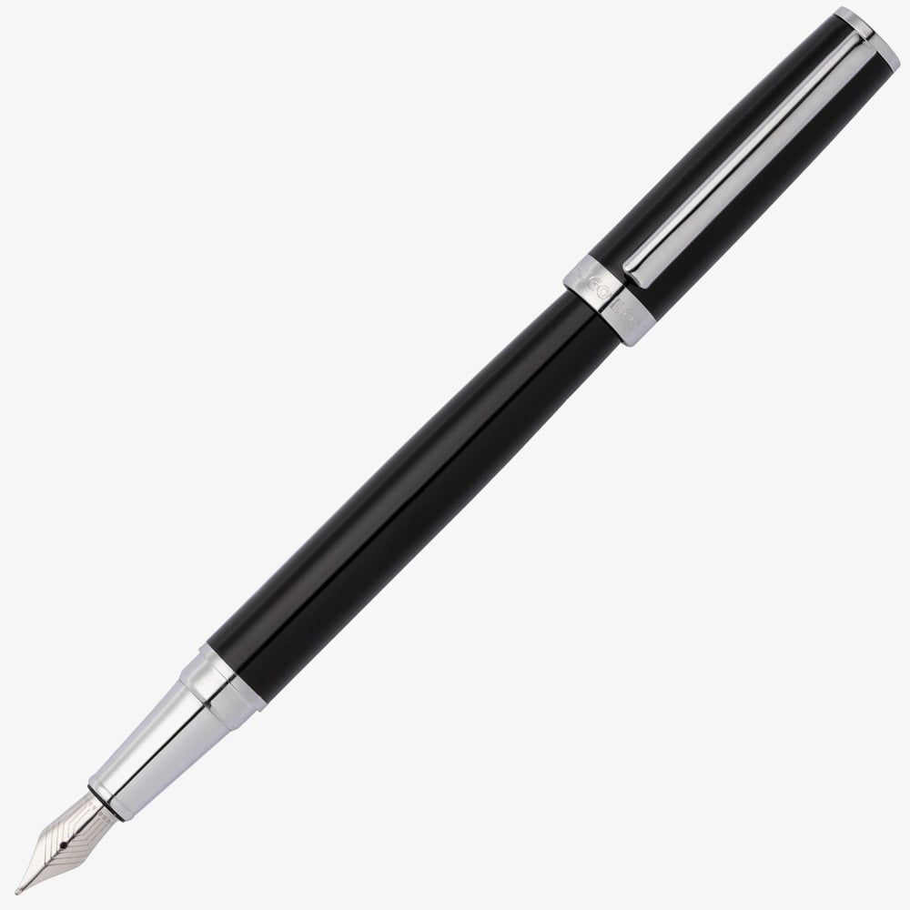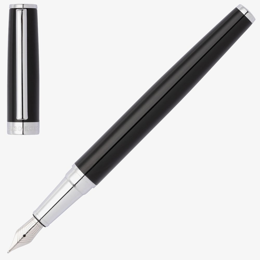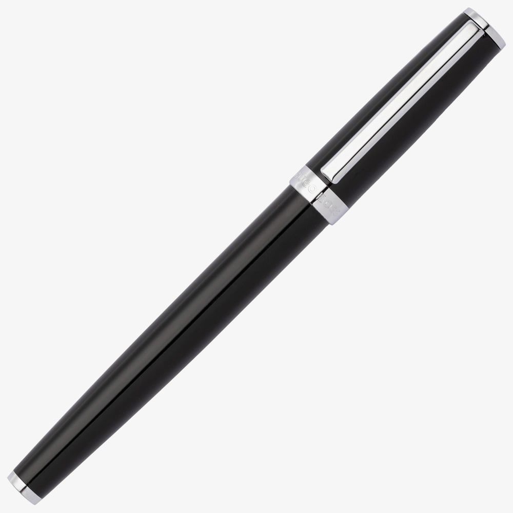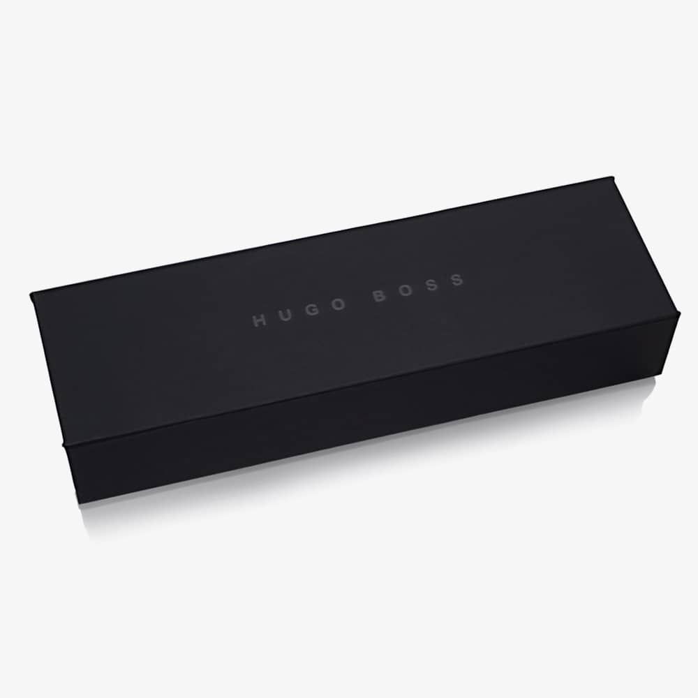 A BOSS Gear Icon pen made from brass. This pen also has a black metallic shiny paint & chrome plated finish & has a measurement of 12mm in diameter & 138mm in height.