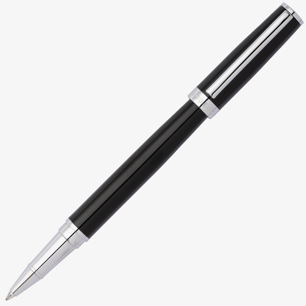 A BOSS Gear Icon pen made from brass. This pen also has a black metallic shiny paint & chrome plated finish & has a measurement of 12mm in diameter & 138mm in height.