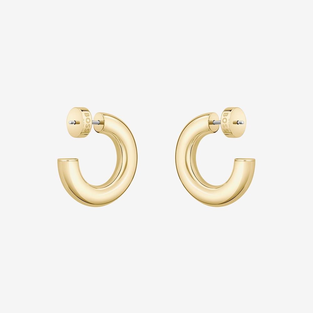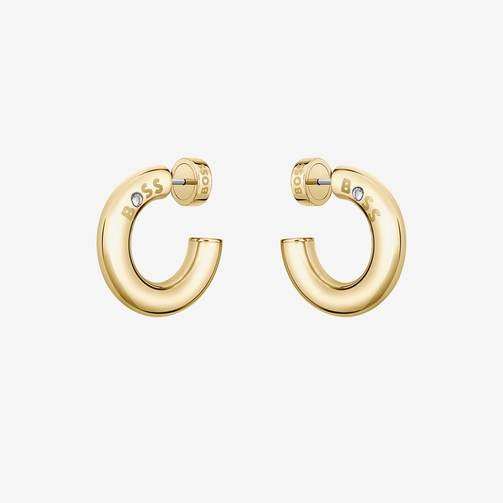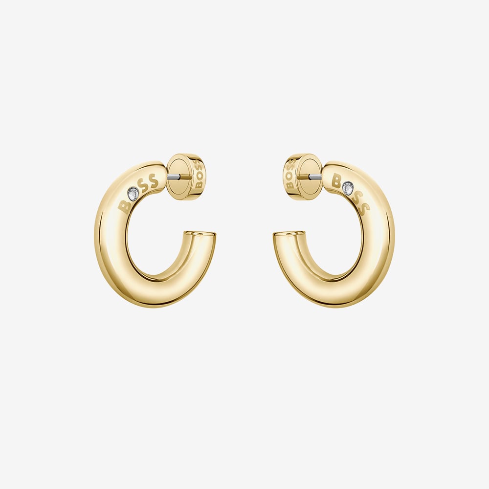 Make a bold style statement with the BOSS Gold-Tone Crystal Logo Hoop Earring. Featuring a sleek gold-tone finish, shimmering crystal accents, and the iconic BOSS logo, this hoop adds a touch of luxury and modern elegance to any look.