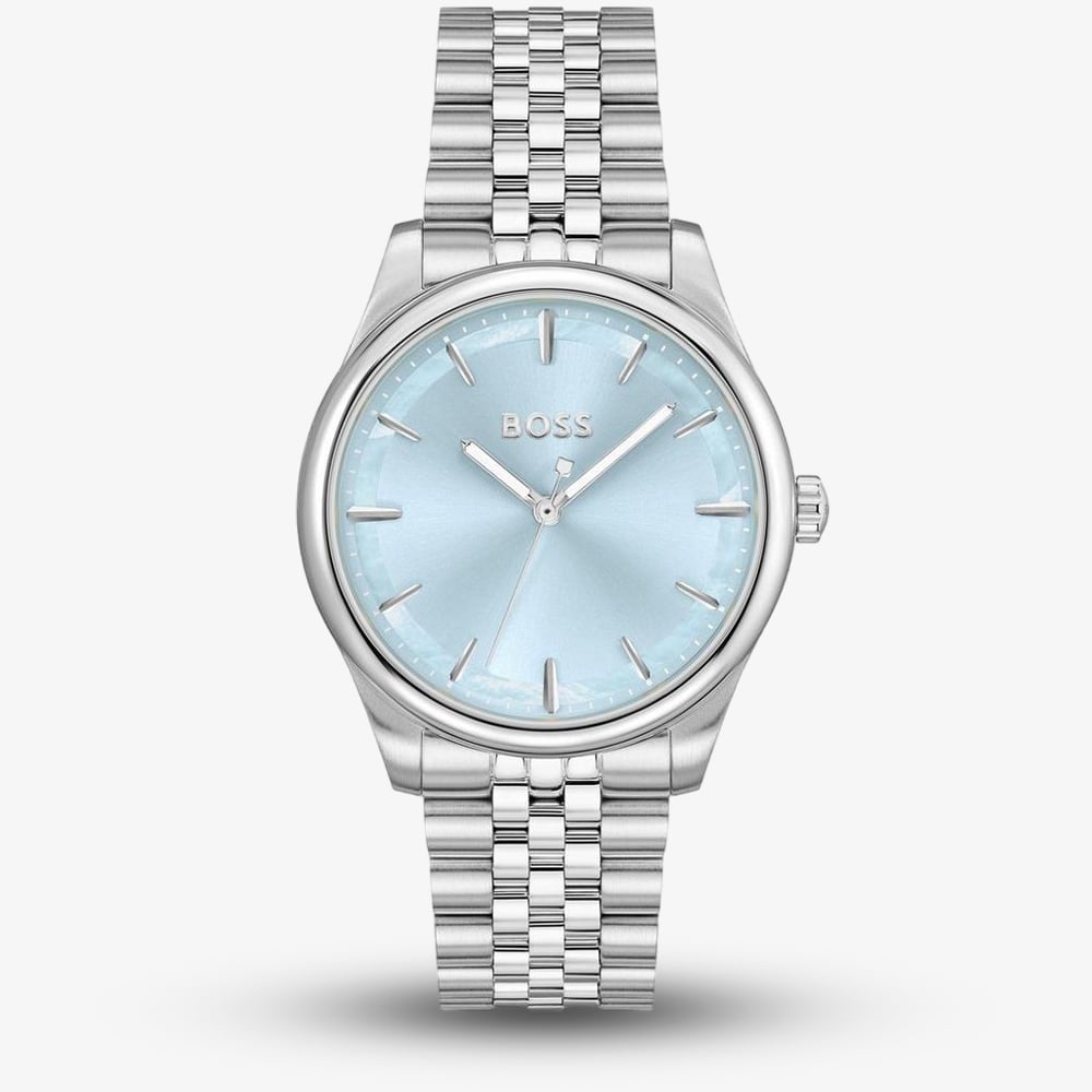 The BOSS Graceful ladies' watch features a sleek stainless steel case and bracelet, elegantly complementing its blue dial. Powered by a precise quartz movement, this timepiece blends sophistication with functionality, making it a perfect accessory for any occasion.