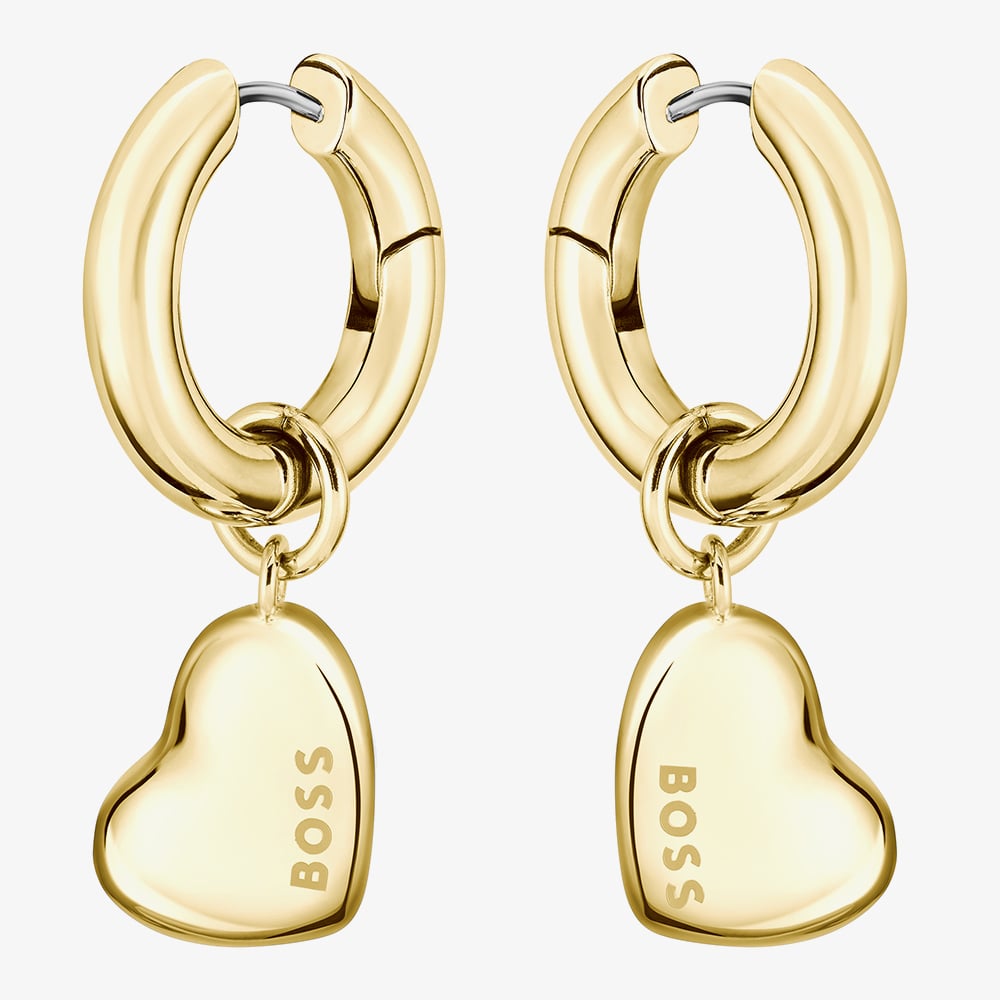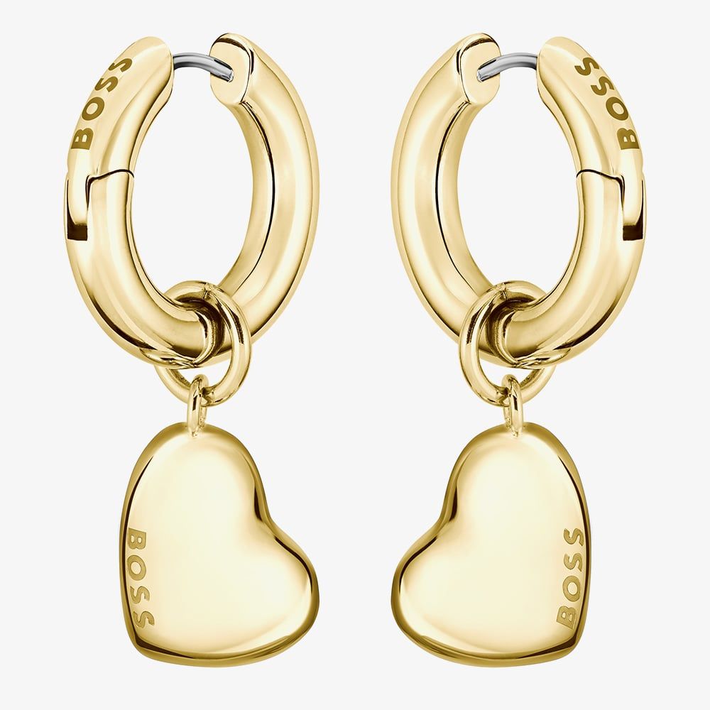 Add a romantic touch to your style with the Honey Love Gold-Tone Heart Dangle Hoop Earrings. Featuring delicate heart-shaped charms that dangle from polished gold-tone hoops, these earrings bring playful elegance to any outfit.
