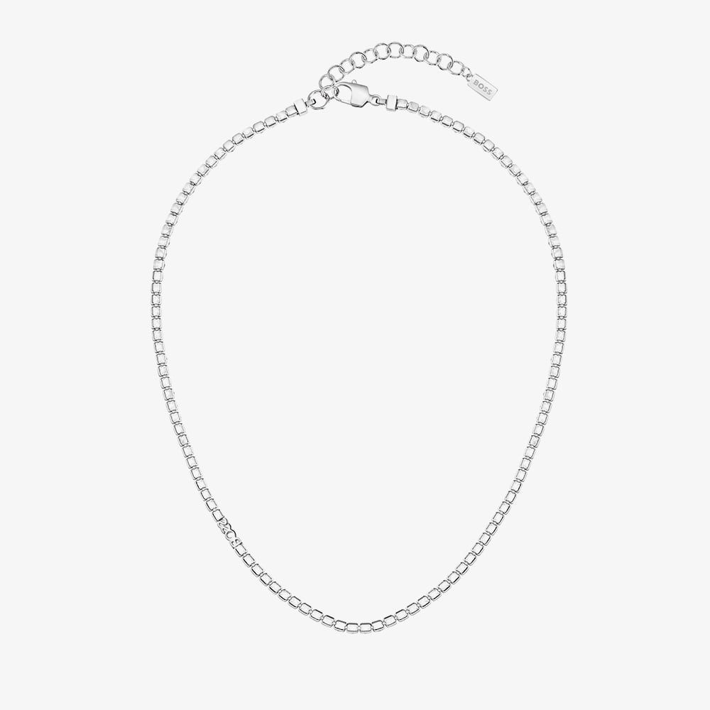 Shimmer with subtle elegance wearing the Boss Kaspr Necklace, crafted in a sleek silver-tone finish and adorned with sparkling champagne crystals. This sophisticated piece adds a touch of glamour and modern luxury to any outfit, perfect for day-to-night wear.