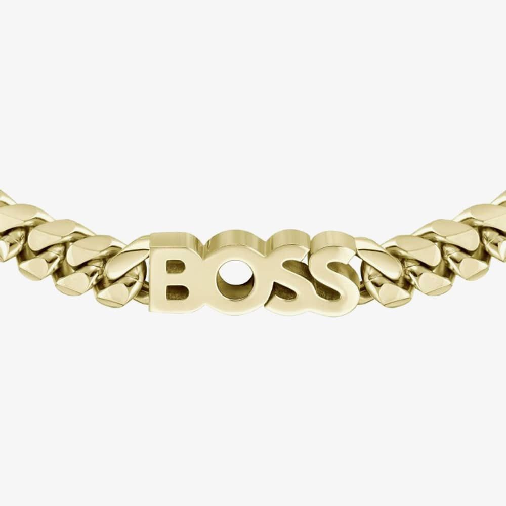Crafted from stainless steel with yellow gold IP plating, this accessory seamlessly combines durability with sophistication. The distinctive Boss logo at the front adds a touch of iconic flair, making it the perfect statement piece for any occasion.