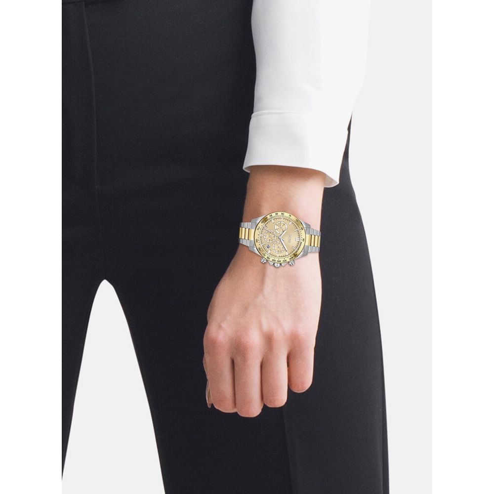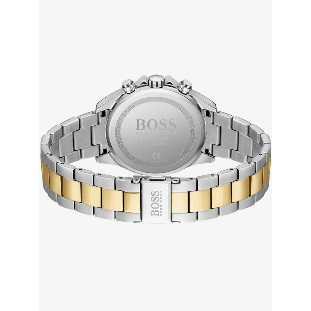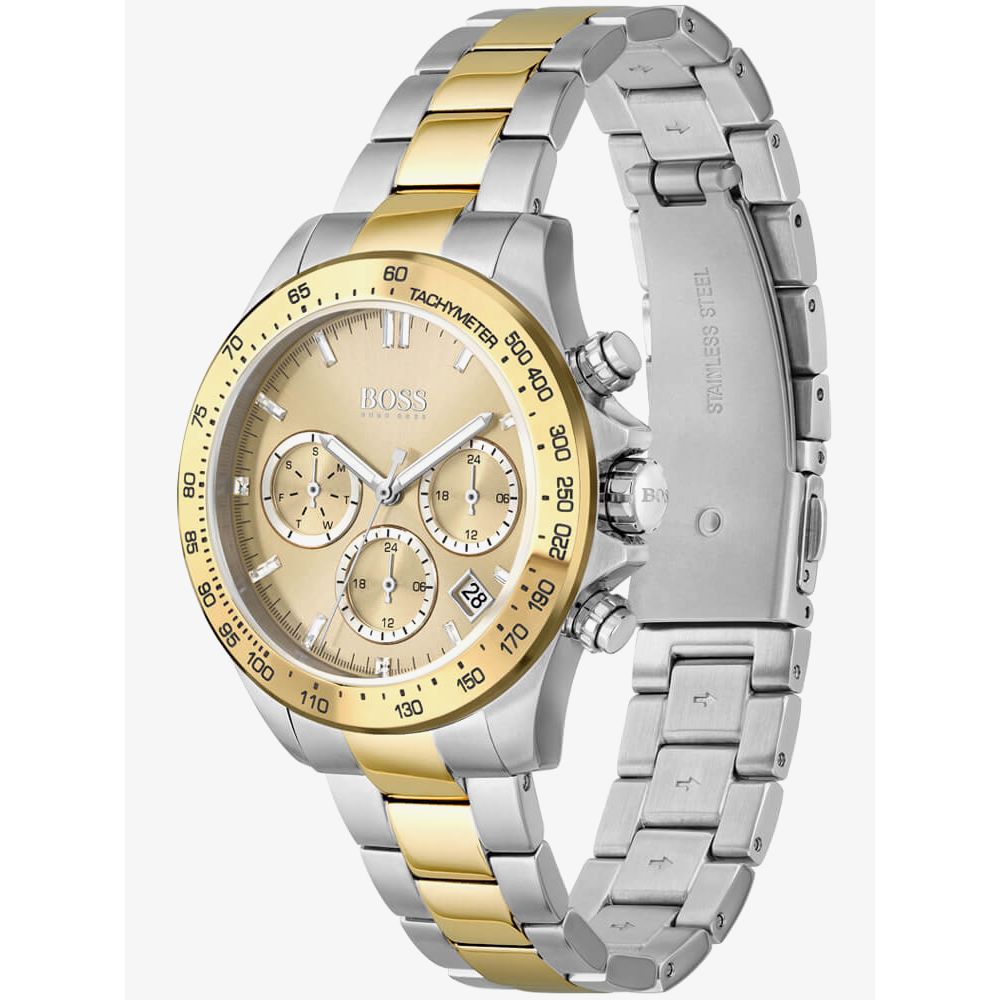 The BOSS Ladies Novia Watch 1502618 combines a 38mm round shaped two tone stainless steel case and bracelet with a push button deployment clasp. It has a gold tone analogue dial with three sub dials and a date window between four and five o-clock, which is protected beneath mineral crystal glass. There is also a tachymeter function on the bezel. Power is generated by the quartz movement. This model also has a water resistance of up to 50 metres.