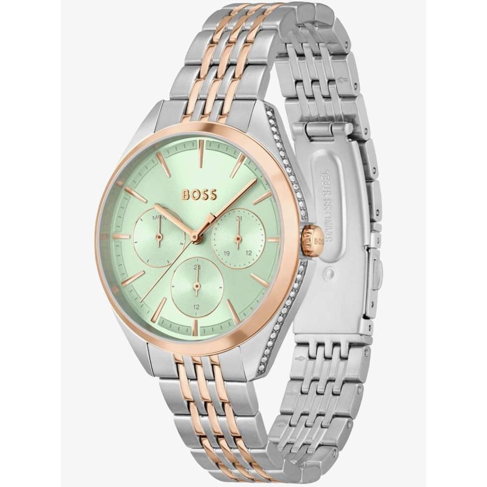The BOSS 1502641 Saya watch combines a 37mm round-shaped stainless steel case and two-tone stainless steel bracelet with a push-button deployment clasp. This beautiful watch features a run of white crystals set into the sides of the case and lugs. It has a mint green sunray-brushed analogue dial with three rose gold-plated day and date sub-dials, protected beneath mineral crystal glass. Power is generated by the quartz movement. This model also has a water resistance of up to 30 metres.