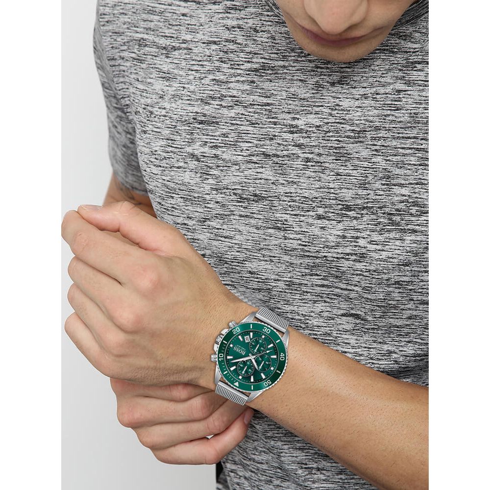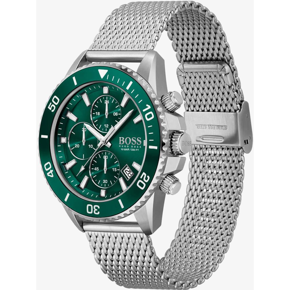 The BOSS Mens Admiral Watch 1513905 combines a 45mm round shaped stainless steel case and a stainless steel mesh bracelet with a fold over clasp. It has a green chronograph display dial with luminescent hands and hour markers and a date window between four and five o-clock, which is protected beneath mineral crystal glass. Power is generated by the quartz movement. This model also has a water resistance of up to 100 metres.