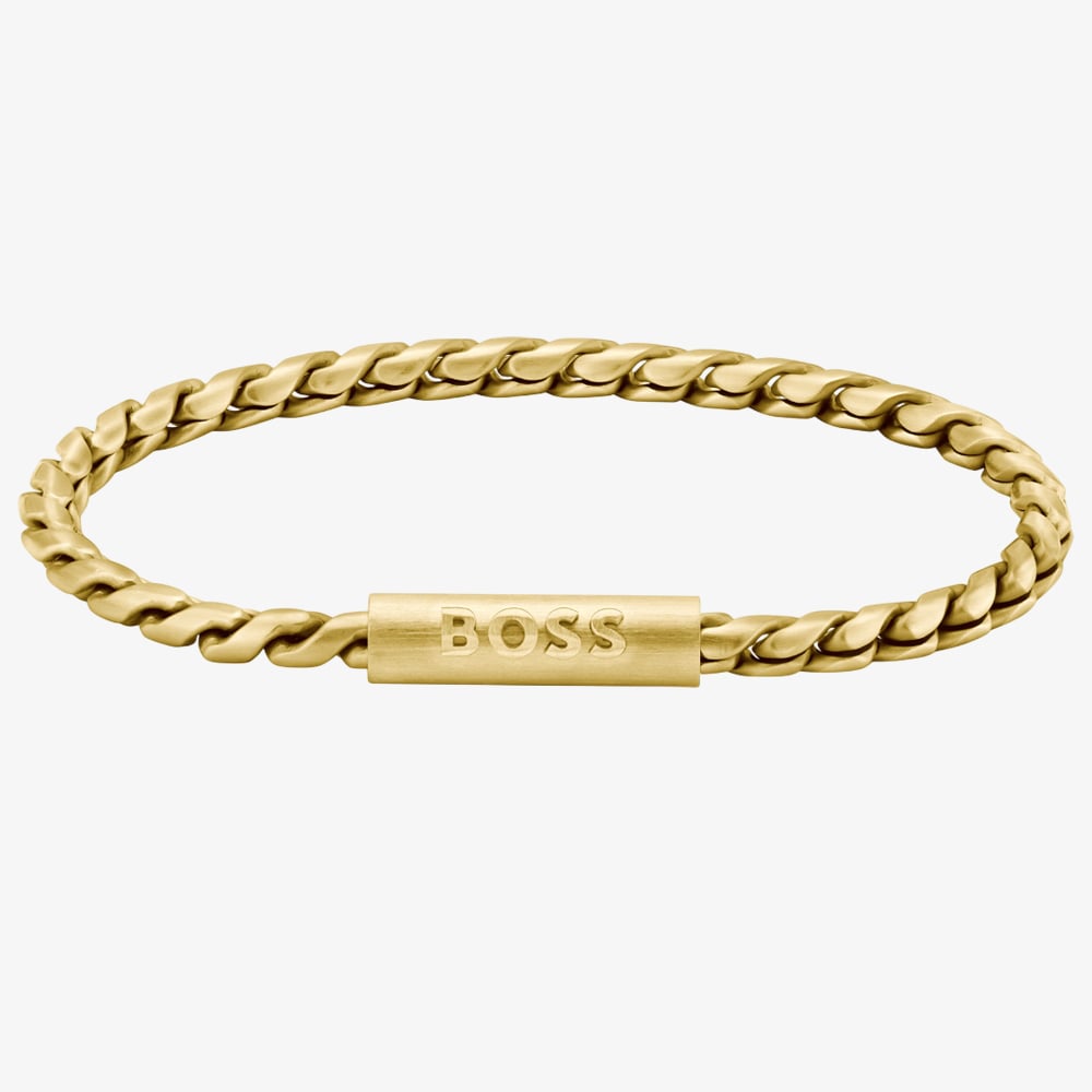 Crafted from polished gold-tone metal, this bracelet exudes a subtle yet luxurious feel. It features a sleek design with a distinctive logo clasp, subtly showcasing the BOSS brand. Its minimalist aesthetic ensures versatility, effortlessly complementing both casual and formal attire. This bracelet adds a touch of refined elegance to any look and makes a thoughtful gift.