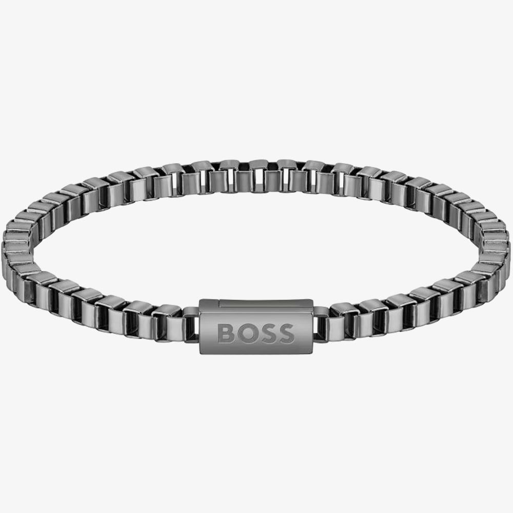 The BOSS Jewellery Mens Chain Bracelet 1580290 is created in stainless-steel. This GREY-tone bracelet features a 4.2mm wide open box style link design, measures 19cm in length & is finished with a logo magnetic fastening.