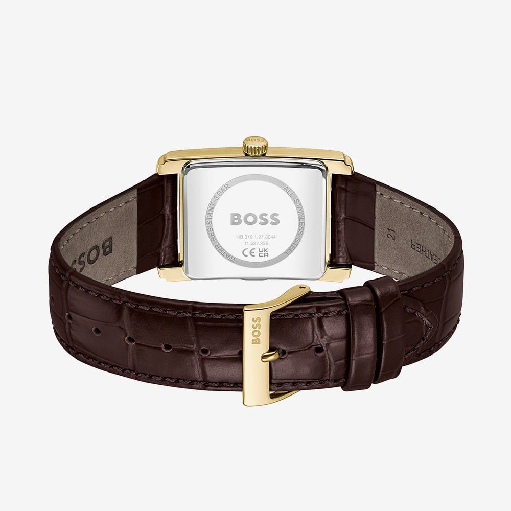 Refined and timeless, the BOSS Principle pairs classic style with modern elegance. It features a 28x39mm gold-tone stainless steel case and a rich brown leather strap for a sophisticated look. The rectangular silver dial is accented with gold-tone Roman numerals, baton hour markers, and hands, offering a clean and elegant display. Perfect for formal occasions or everyday sophistication, this watch is a standout accessory for the modern gentleman.