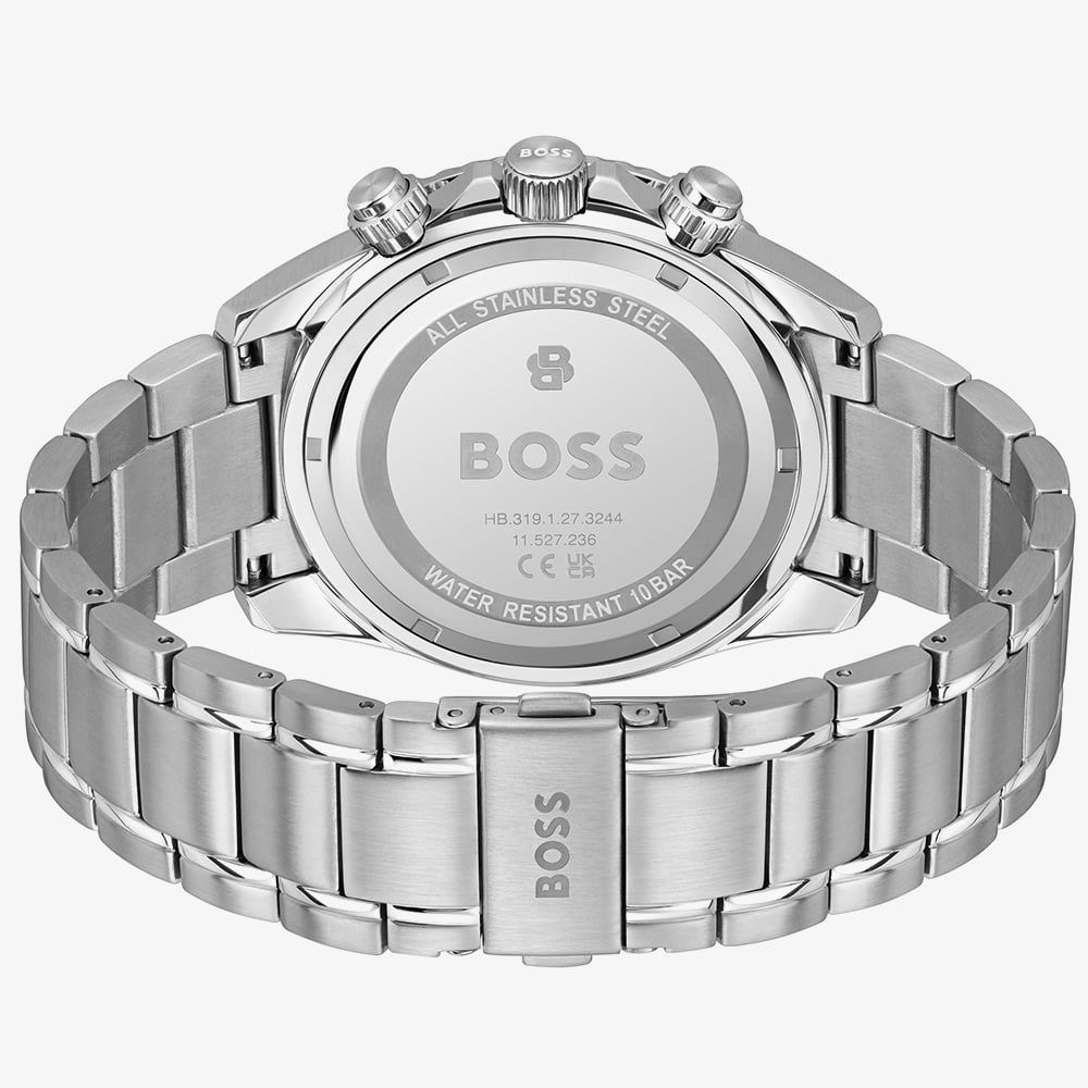 The BOSS Sealiner 1514322 draws on the spirit of exploration, blending nautical inspiration with a confident, modern aesthetic. Its robust case is framed by a wide unidirectional bezel, enamel filled for a smooth, tactile finish that feels purposeful and precise. On the dial, diamond cut subdial rings catch the light subtly, adding depth and refinement, while luminous hands and indexes ensure clear readability in changing conditions. The overall design feels balanced and assured, with crisp detailing that reflects careful craftsmanship and a strong sense of direction.
