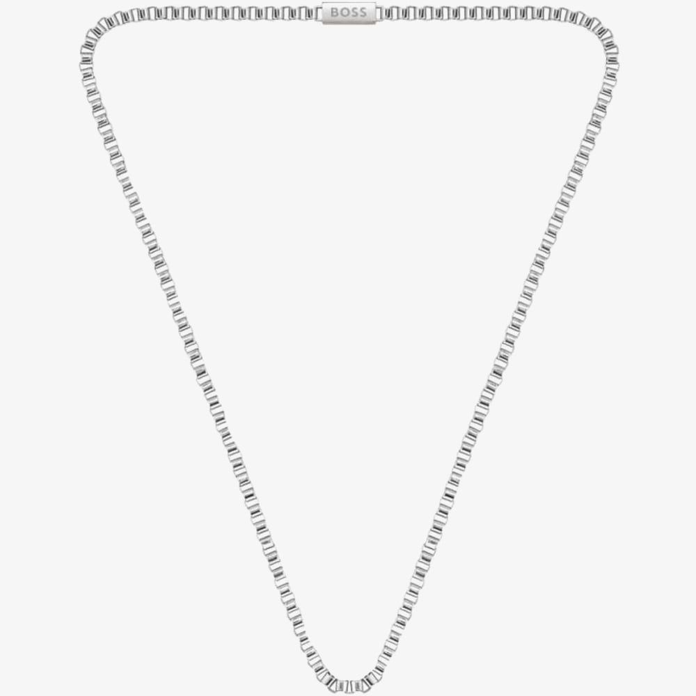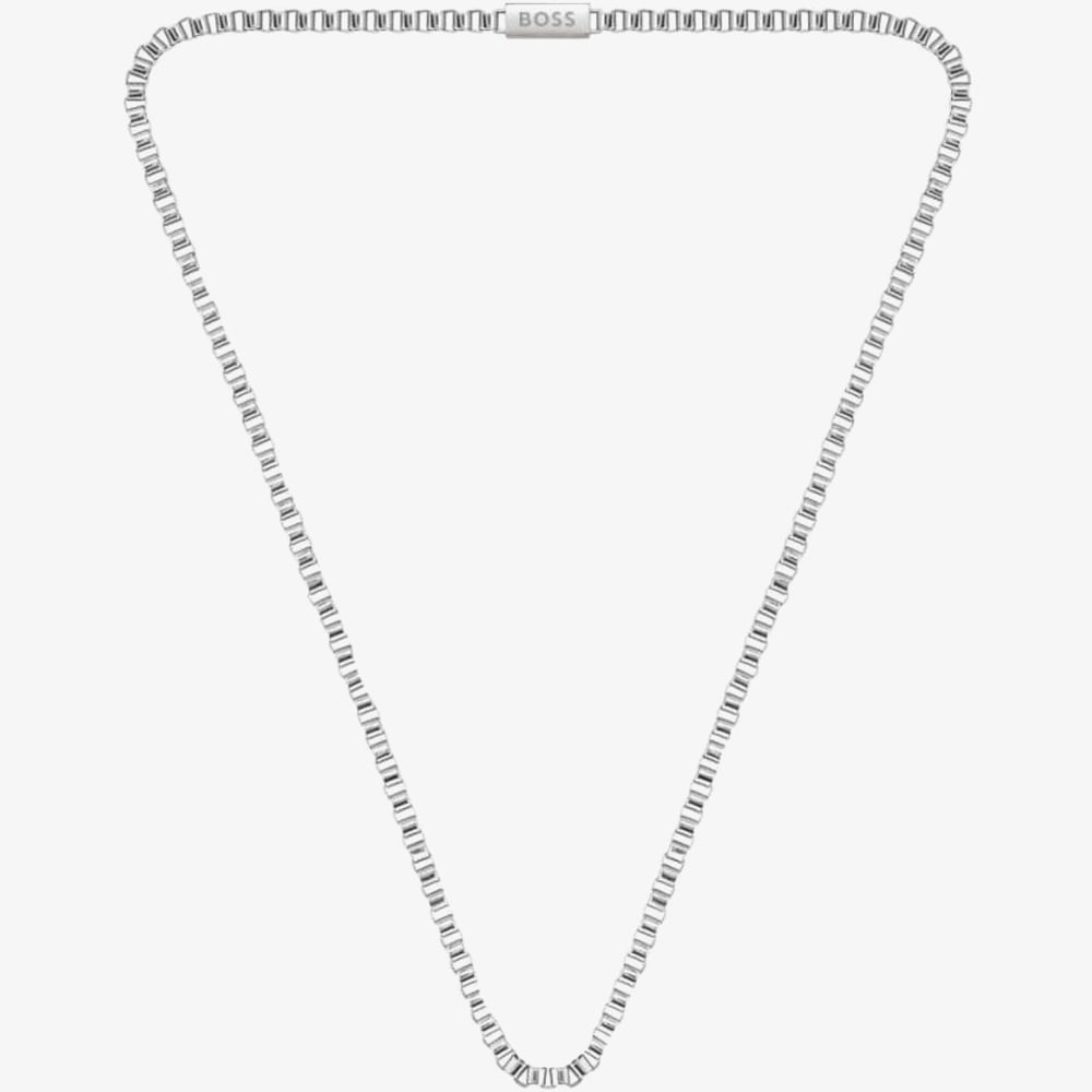 The BOSS Jewellery Mens Stainless-Steel Chain 1580292 is created in stainless steel. This silver-tone necklace features a 4.2mm wide box style link chain design. This necklace measures 58cm in length & is finished with a magnetic fastening.