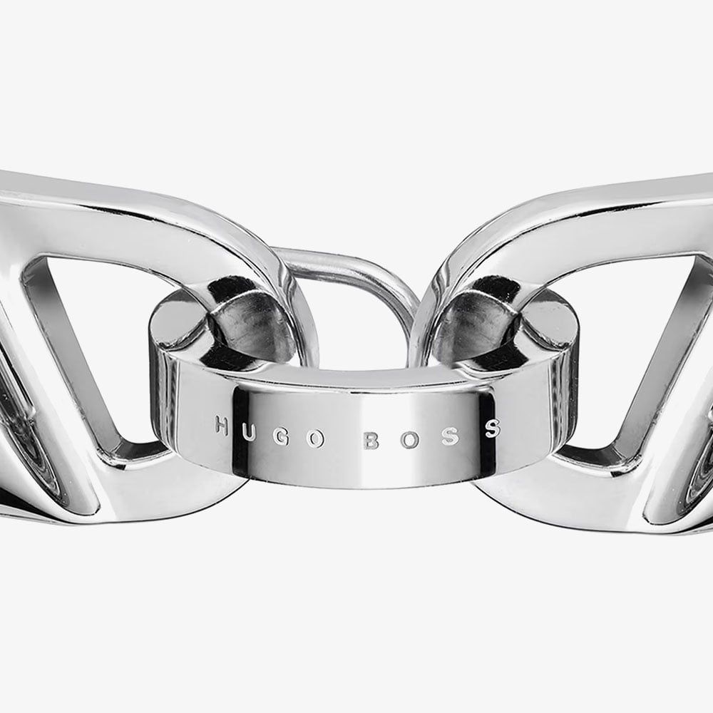 This elegant BOSS bracelet, crafted from stainless steel, measures 7 inches in length and features the iconic Boss logo on the centre clasp.