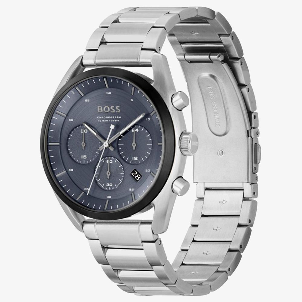 Crafted in polished silver stainless steel, this timepiece features a sophisticated blue dial adorned with a functional chronograph. With its sleek design and chronograph features, the Boss Top watch is the ideal companion for the modern man who values both functionality and elegance.