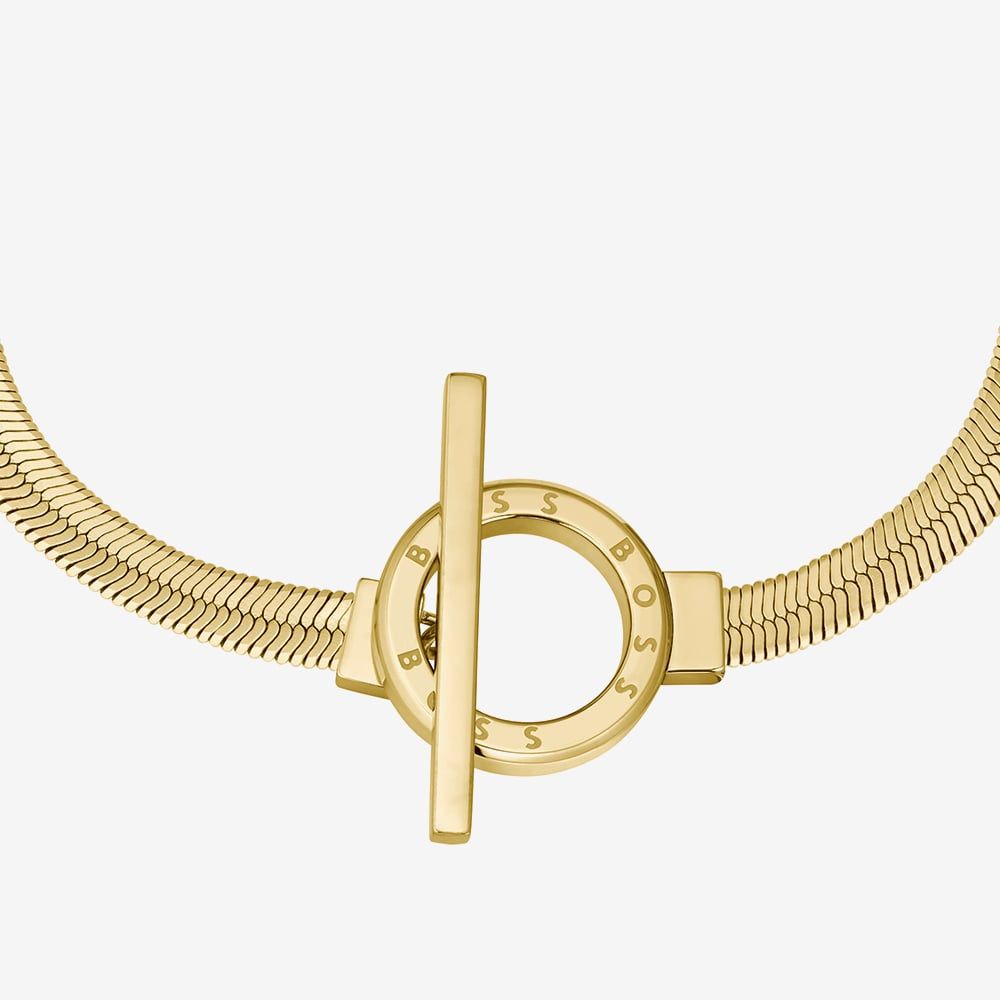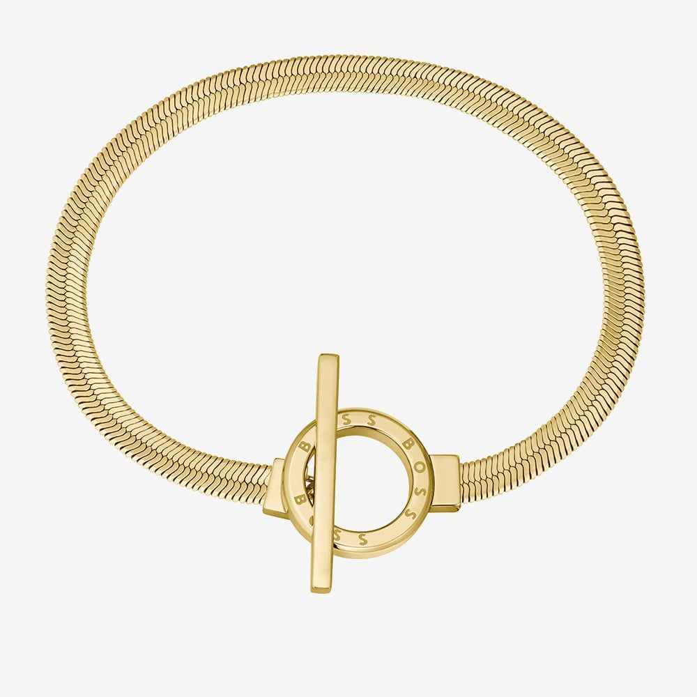 Sleek and modern, this gold-tone bracelet features a smooth snake chain and a minimalist T-bar clasp. Finished with subtle BOSS branding, it’s the perfect blend of elegance and edge — ideal for everyday wear or elevated looks.