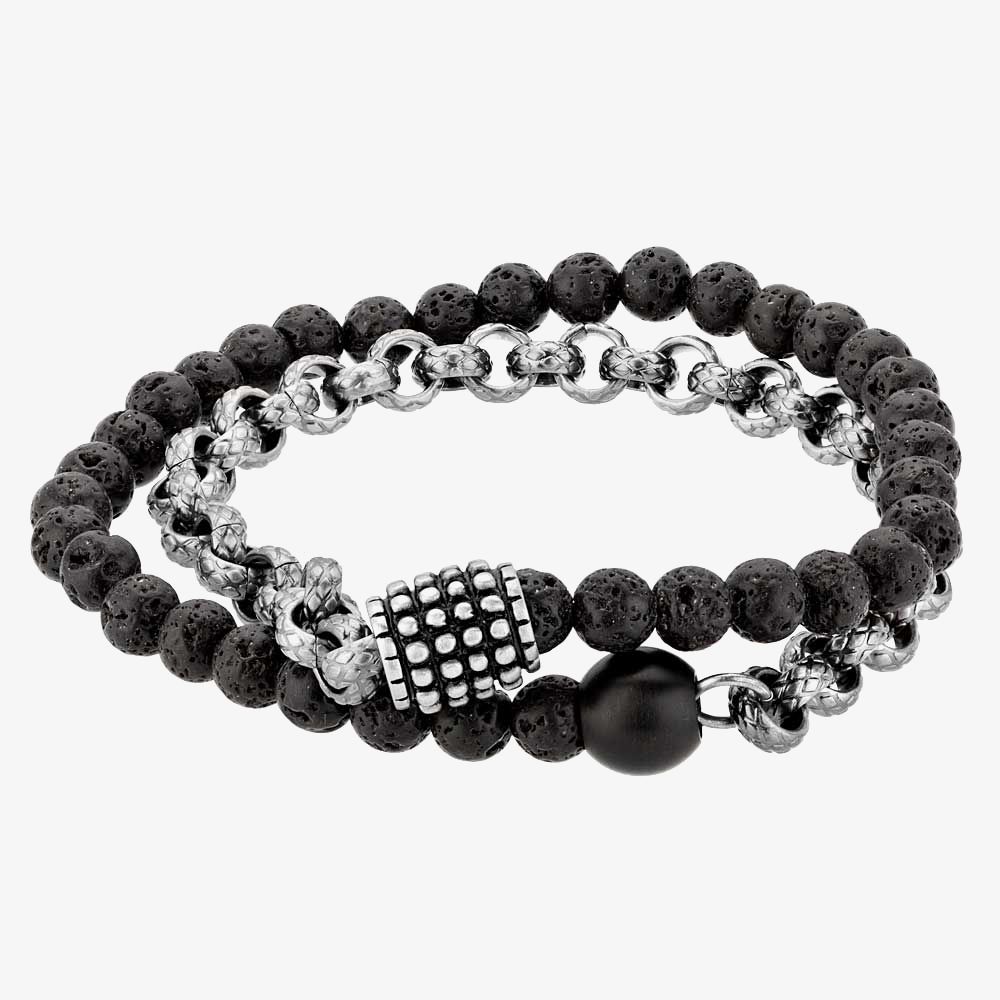 This highly unique double wrap bracelet from Bourne and Wilde combines a diamond patterned chain depicting snake skin with a collection of 6mm lava stones. This ingenious design measures 42cm long and also features a stainless steel barrel centrepiece and matte black bead joining each of the two sections together. Add an alternative edge to any outfit with this stylish wrap bracelet.