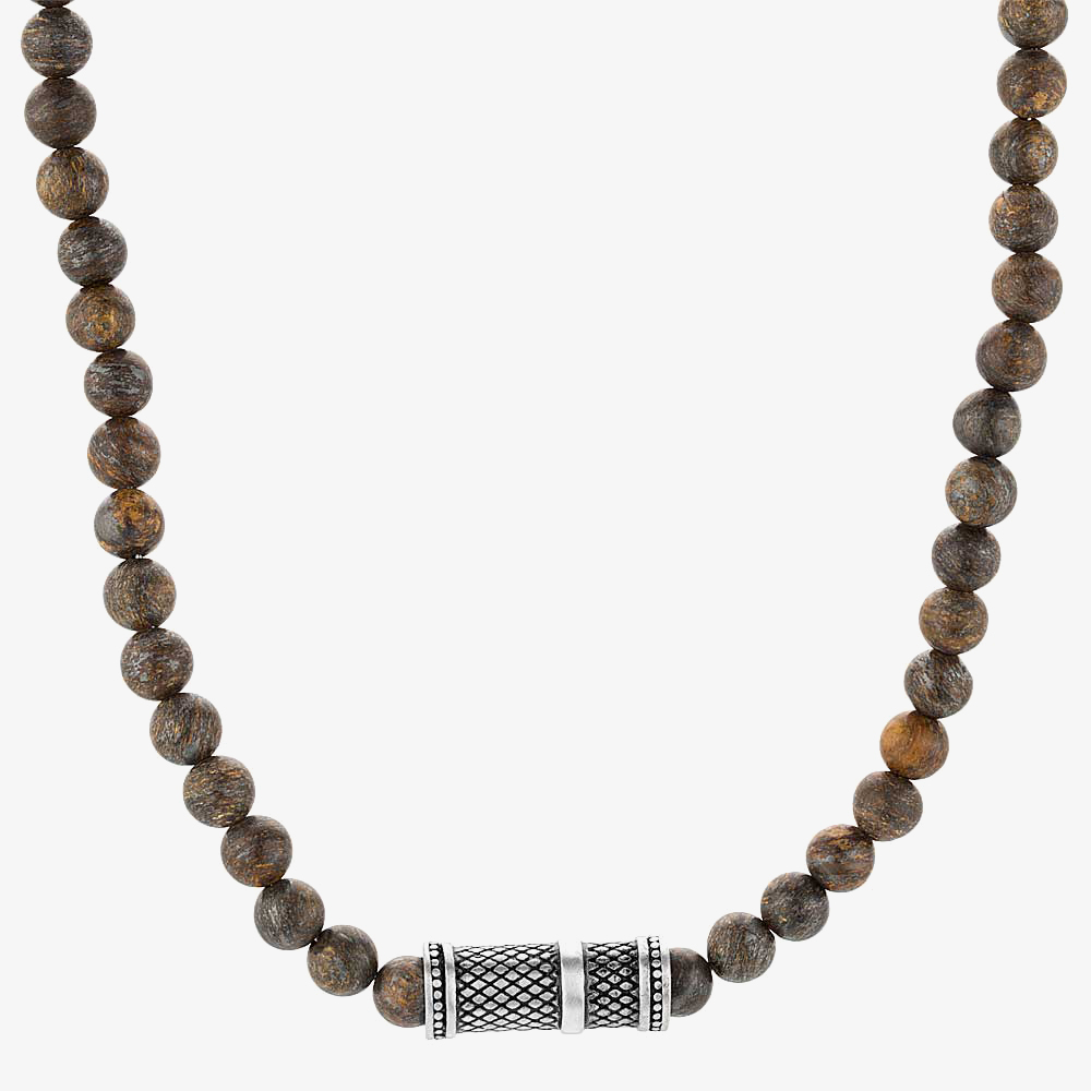 This stylish piece is brought to you by Bourne and Wilde and consists of a collection of smooth bronzite beads. At the centre of this 50cm long necklace is a diamond patterned stainless steel barrel depicting snake skin, providing an edgy focal point.
