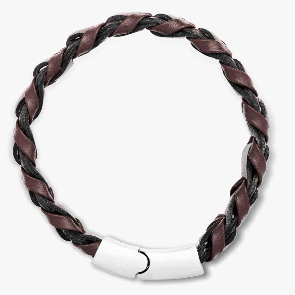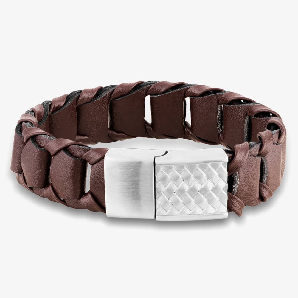 The Bourne and Wilde OSB-2356SBN bracelet is made from wide strands of dark brown leather and fastens using a stainless steel clasp.