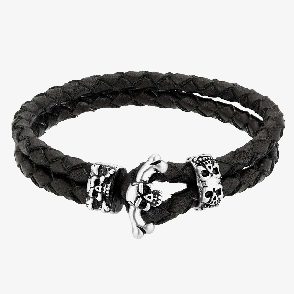 This Bourne and Wilde bracelet consists of a double layer of black braided leather. At the centre of this piece is a skull and cross bones clasp with a matching bracelet end cap and skull decor gripper bead. Give yourself the alternative edge you desire.