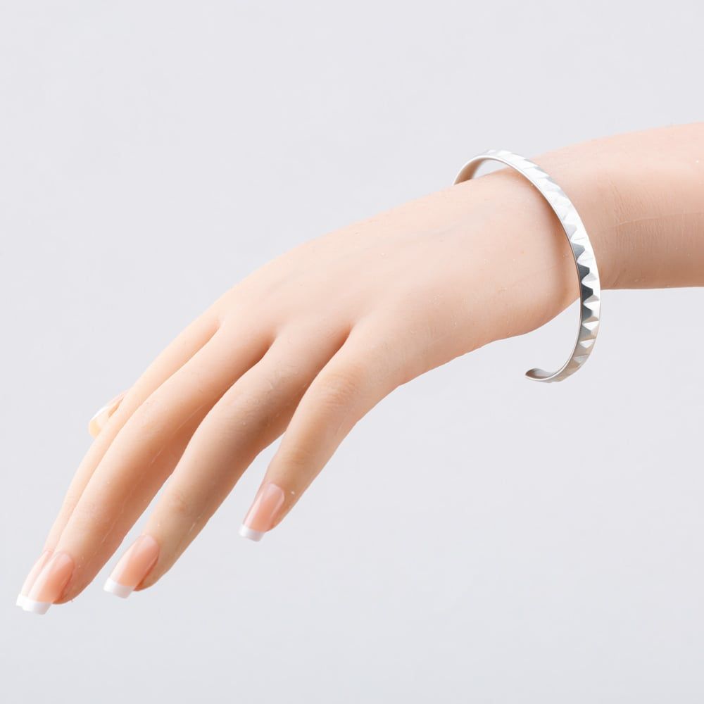 Make a bold statement with this stainless steel cuff bangle, featuring a distinctive textured pyramid design. Its geometric detailing adds depth and edge, while the polished steel finish ensures a sleek, modern look. Durable yet refined, this cuff is perfect for adding a touch of strength and sophistication to any outfit, whether worn alone or layered.