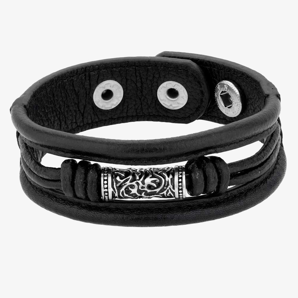 Bourne and Wilde have created this bracelet comprised of black leather and stainless steel. The centrepiece of this is a stainless steel barrel featuring a tribal themed pattern accentuated with black oxidised detailing. This three row bracelet also includes two knots in the centre to secure the barrel in place and adjustable two button fastening system.