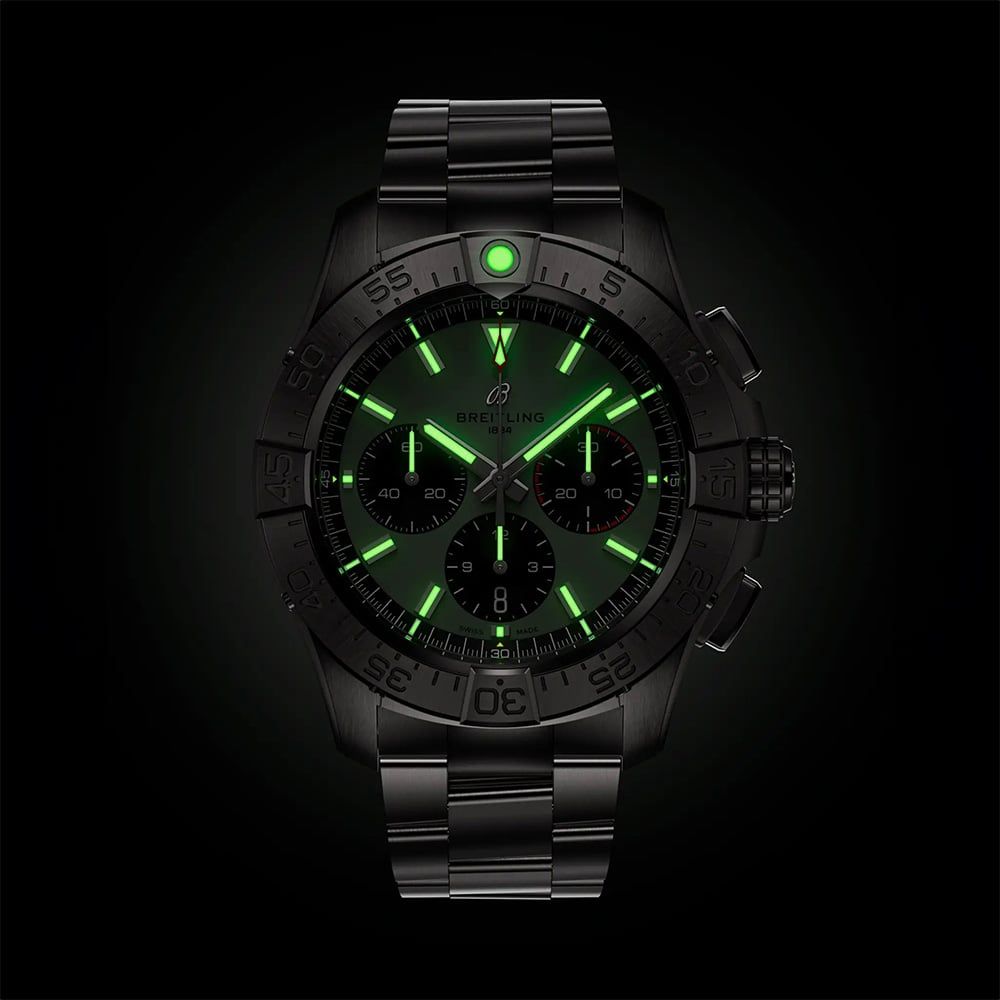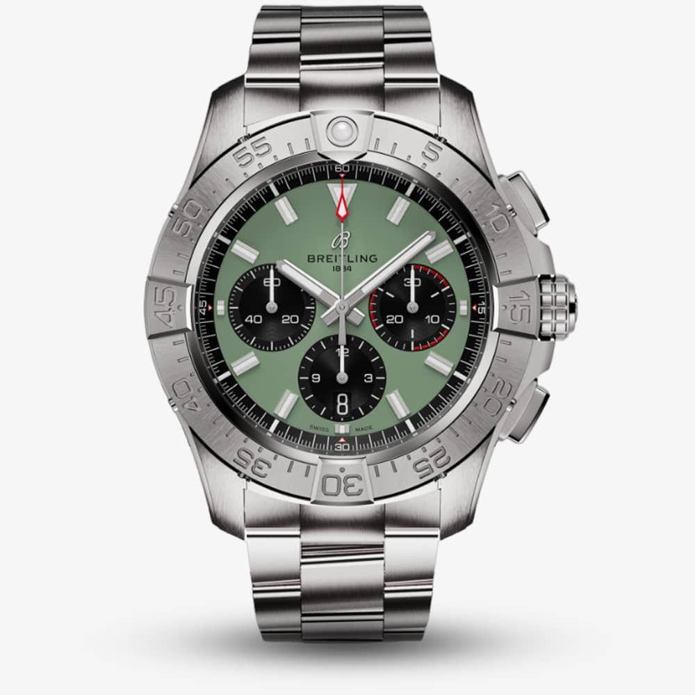 The Breitling Avenger B01 Chronograph 44 features a green dial drawn from military uniform shades with luminescent batons and a red second tacker. Featured is a 60-minute uni-directional bezel with protective 4-rider tabs, three chronograph sub-dials, and a date window integrated into the middle dial. This timepiece boasts precision with its Breitling Calibre 01 automatic movement. You don’t need Air Force credentials to appreciate its bold design, exceptional resilience, and next-level functionality. Get ready for the new Avenger.