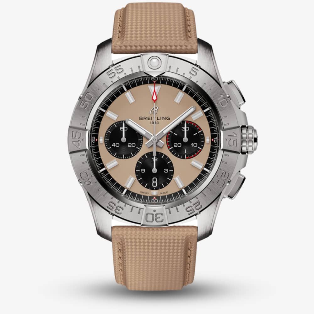 https://www.thbaker.co.uk/breitling-avenger-b01-chronograph-44-sand-leather-strap-watch-ab0147101a1x1137674Breitling Avenger B01 Chronograph 44 Sand Leather Strap Watch AB0147101A1X1https://www.thbaker.co.uk/media/catalog/product/2/4/24-12-25113820_breitling_01.jpg55505550GBPOutOfStockAVENGER B01 CHRN 44 SS BEIGE SW BEIGE DL The Breitling Avenger B01 Chronograph 44 features a sand-beige dial drawn from military uniform shades with luminescent batons and a red second tacker. Featured is a 60-minute uni-directional bezel with protective 4-rider tabs, three chronograph sub-dials, and a date window integrated into the middle dial. This timepiece boasts precision with its Breitling Calibre 01 automatic movement. You don’t need Air Force credentials to appreciate its bold design, exceptional resilience, and next-level functionality. Get ready for the new Avenger.