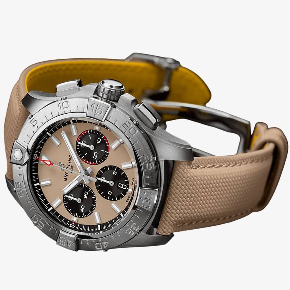 The Breitling Avenger B01 Chronograph 44 features a sand-beige dial drawn from military uniform shades with luminescent batons and a red second tacker. Featured is a 60-minute uni-directional bezel with protective 4-rider tabs, three chronograph sub-dials, and a date window integrated into the middle dial. This timepiece boasts precision with its Breitling Calibre 01 automatic movement. You don’t need Air Force credentials to appreciate its bold design, exceptional resilience, and next-level functionality. Get ready for the new Avenger.
