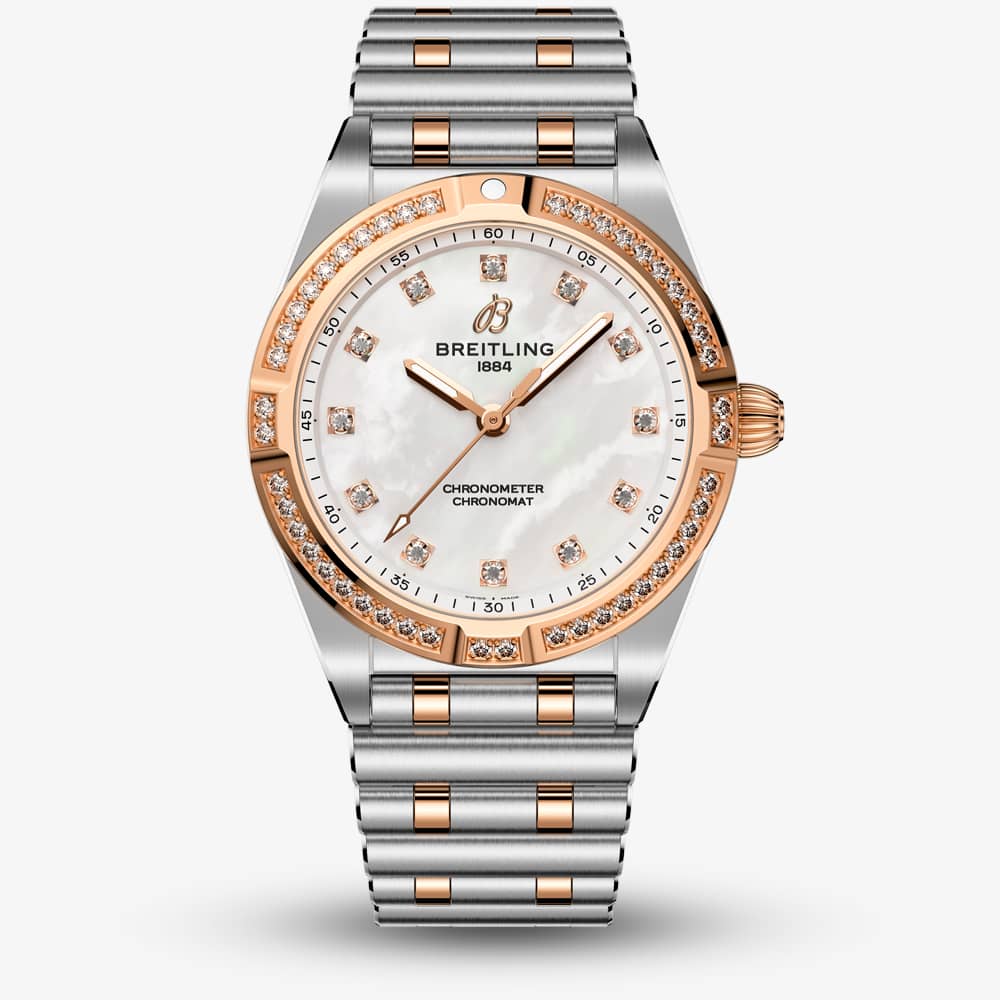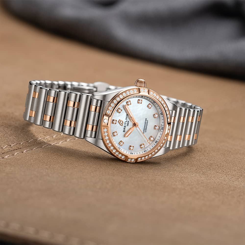 This exquisite timepiece delivers far more than its compact size suggests. With a white mother-of-pearl dial adorned with traceable lab-grown diamonds and sophisticated details paired with a rose gold bezel, it exudes a refined, jewellery-like elegance. Powered by the Breitling Calibre 72, a certified SuperQuartzTM chronometer, the Chronomat 28 ensures exceptional accuracy.