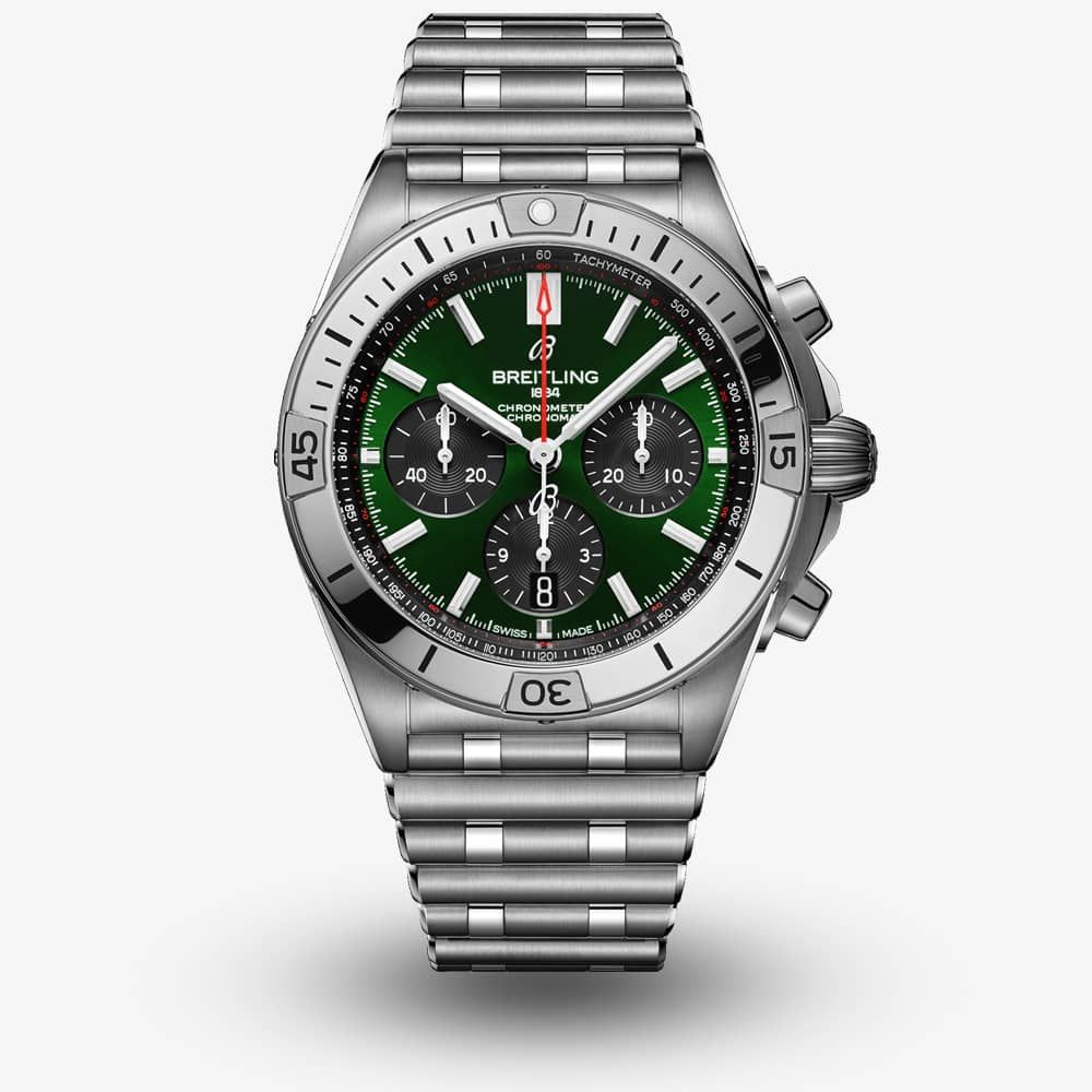 An all purpose watch for your every pursuit - The Breitling Chronomat. Based on the Frecce Tricolour Chronograph - the Chronomat is a celebration of Breitling's Centenary style. Introduced in 1984, thin quartz timepieces were the order of the day - In comparison the Breitling Chronomat was an impressively proportioned mechanical watch. Constructed in stainless steel, the watch features a mechanical chronograph function. The striking and bold green dial is set with contrasting stainless steel luminescent hour markers and hands for easy legibility in low light conditions. The piece is finished with a signature 'Rouleaux' bracelet and is powered by the in-house Breitling Manufacture Caliber 1, a COSC certified chronometer.