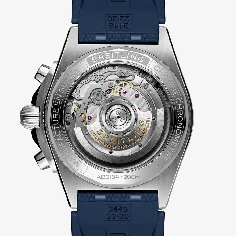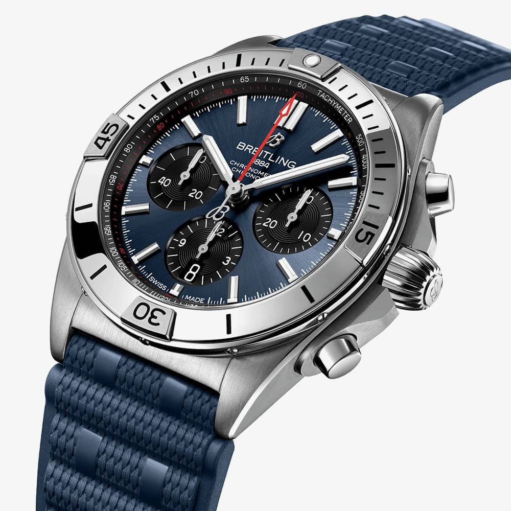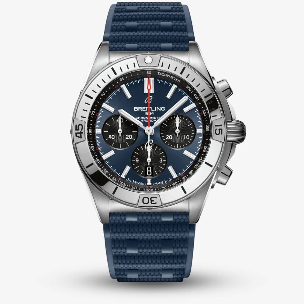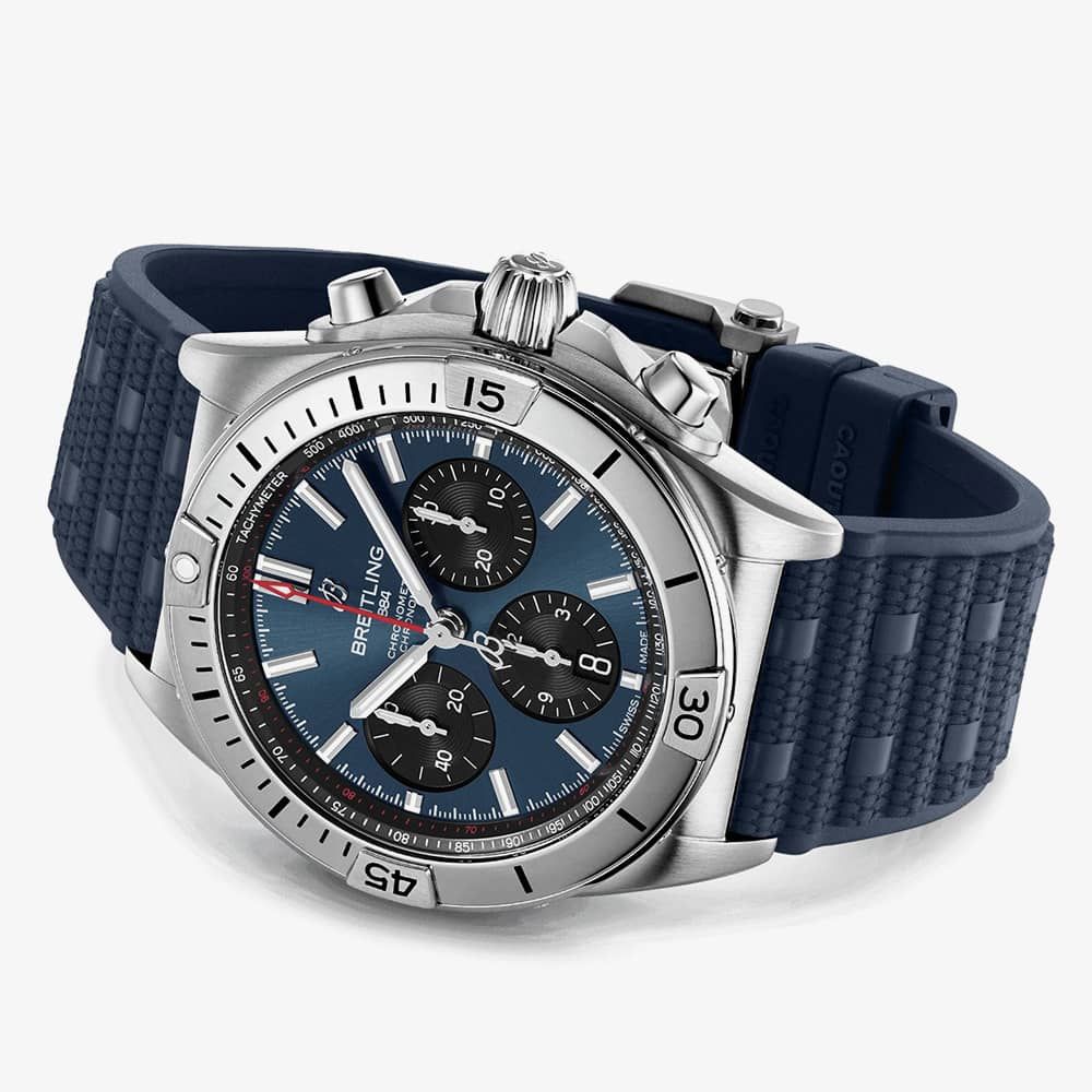 The Chronomat features a 42mm case and the iconic bezel with four rider tabs, it is matched with the signature “Rouleaux” bracelet in metal or rubber and is powered by the in-house Breitling Manufacture Caliber 01, a COSC-certified chronometer.