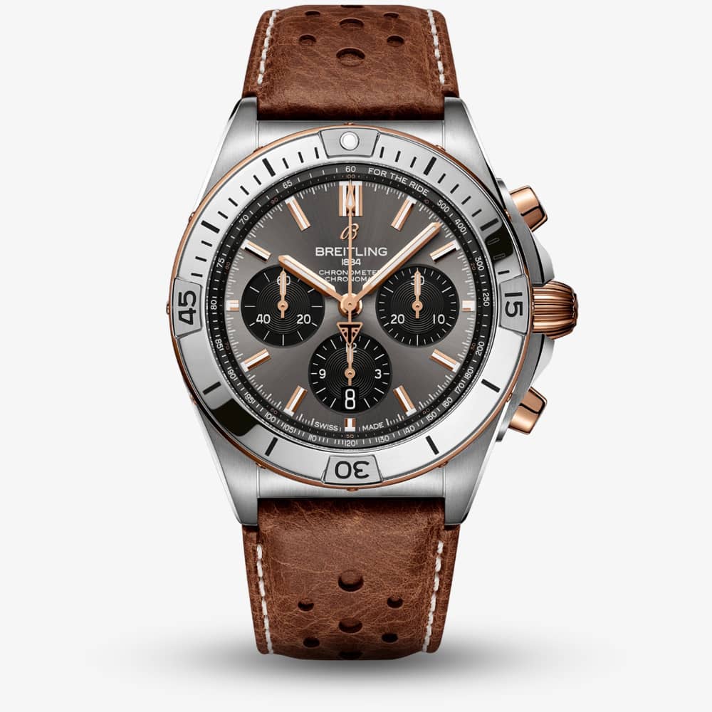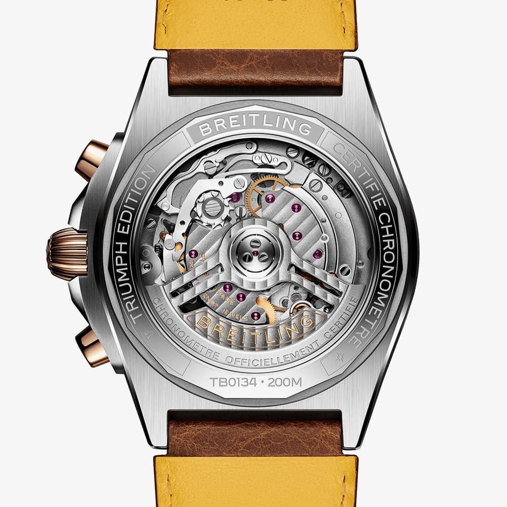 As stunning to look at as it is exhilarating to wear, the Chronomat B01 42 Triumph is crafted with the highest specifications, featuring a titanium and 18k red gold frame. This premium quality is echoed in Triumph’s matching limited-run Speed Triple RR bike, with only 270 of these modern roadsters ever being made. Notable details include the discreet Triumph shield logo on the watch’s central chronograph hand counterweight, the “Triumph Edition” engraving on the caseback, and the perforated calfskin leather strap, all mirroring the bike’s detailing.