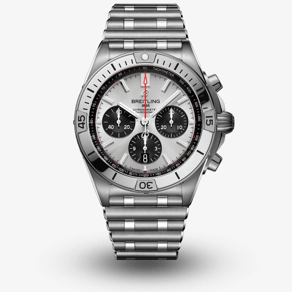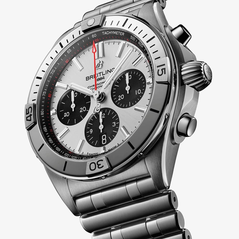 An all purpose watch for your every pursuit - The Breitling Chronomat. Introduced in 1984, thin quartz timepieces were the order of the day - In comparison the Breitling Chronomat was an impressively proportioned mechanical watch. Constructed in stainless steel, the watch features a mechanical chronograph function. The striking silver dial is set with stainless steel luminescent hour markers and hands for easy legibility in low light conditions. The piece is finished with a signature 'Rouleaux' bracelet and is powered by the in-house Breitling Manufacture Caliber 1, a COSC certified chronometer.