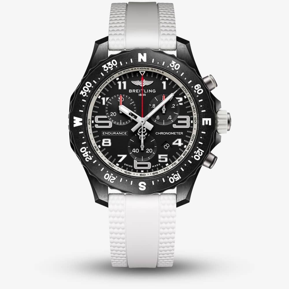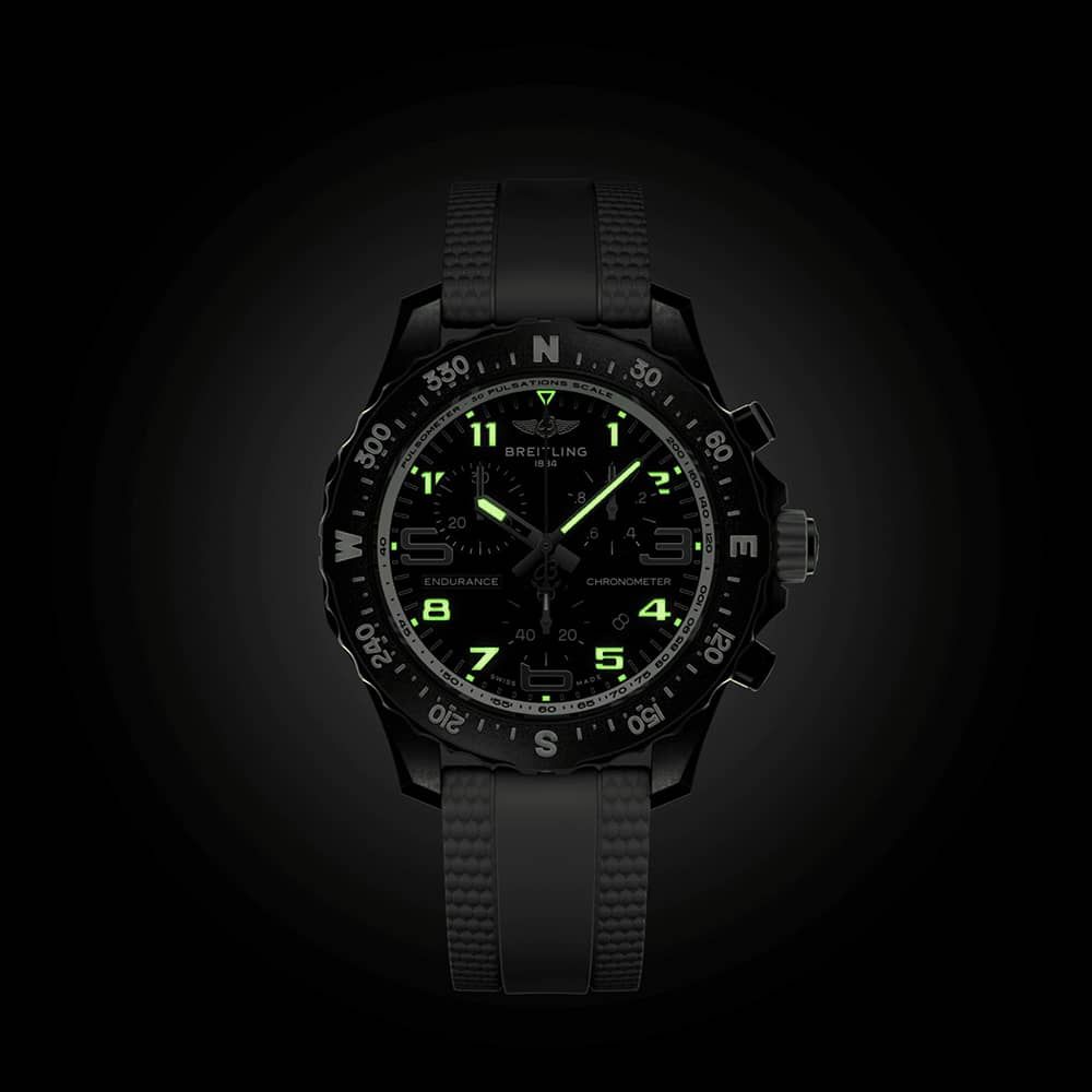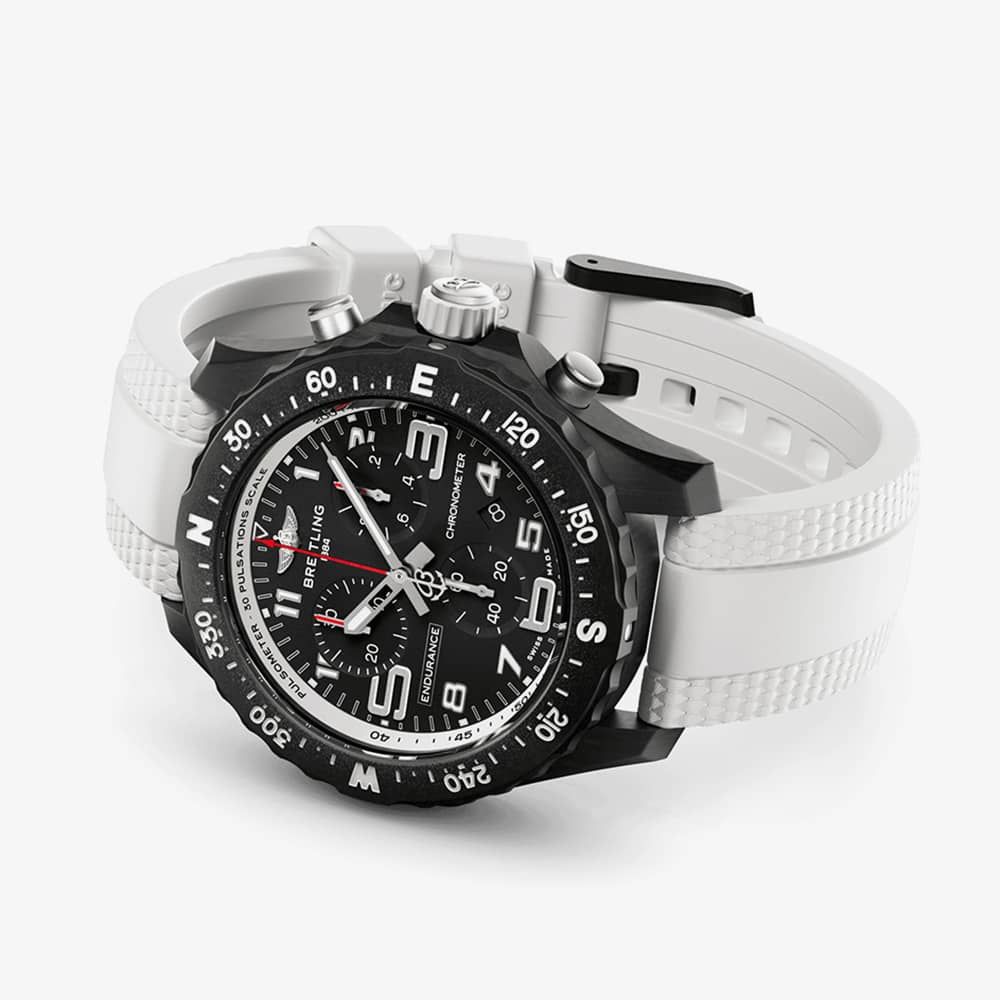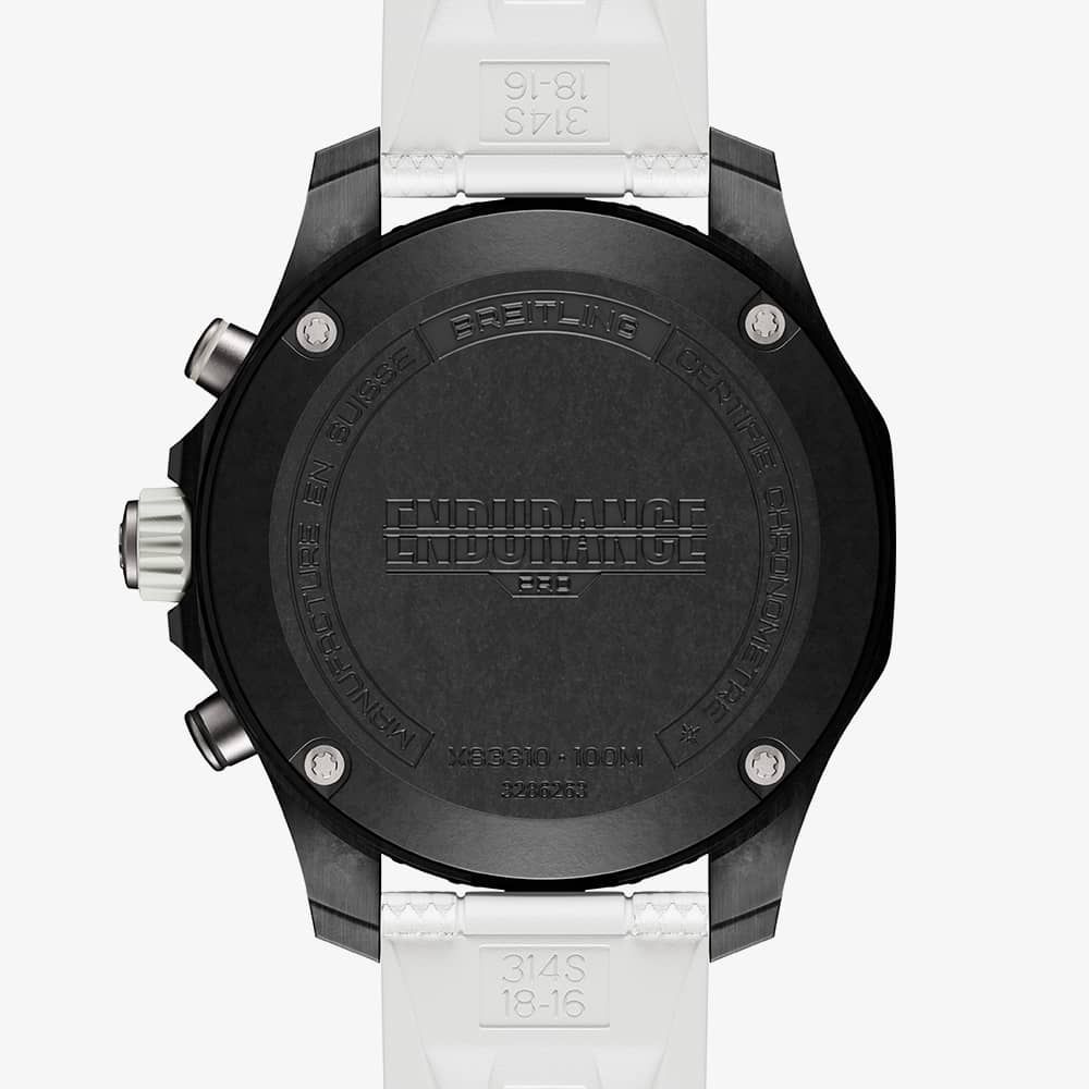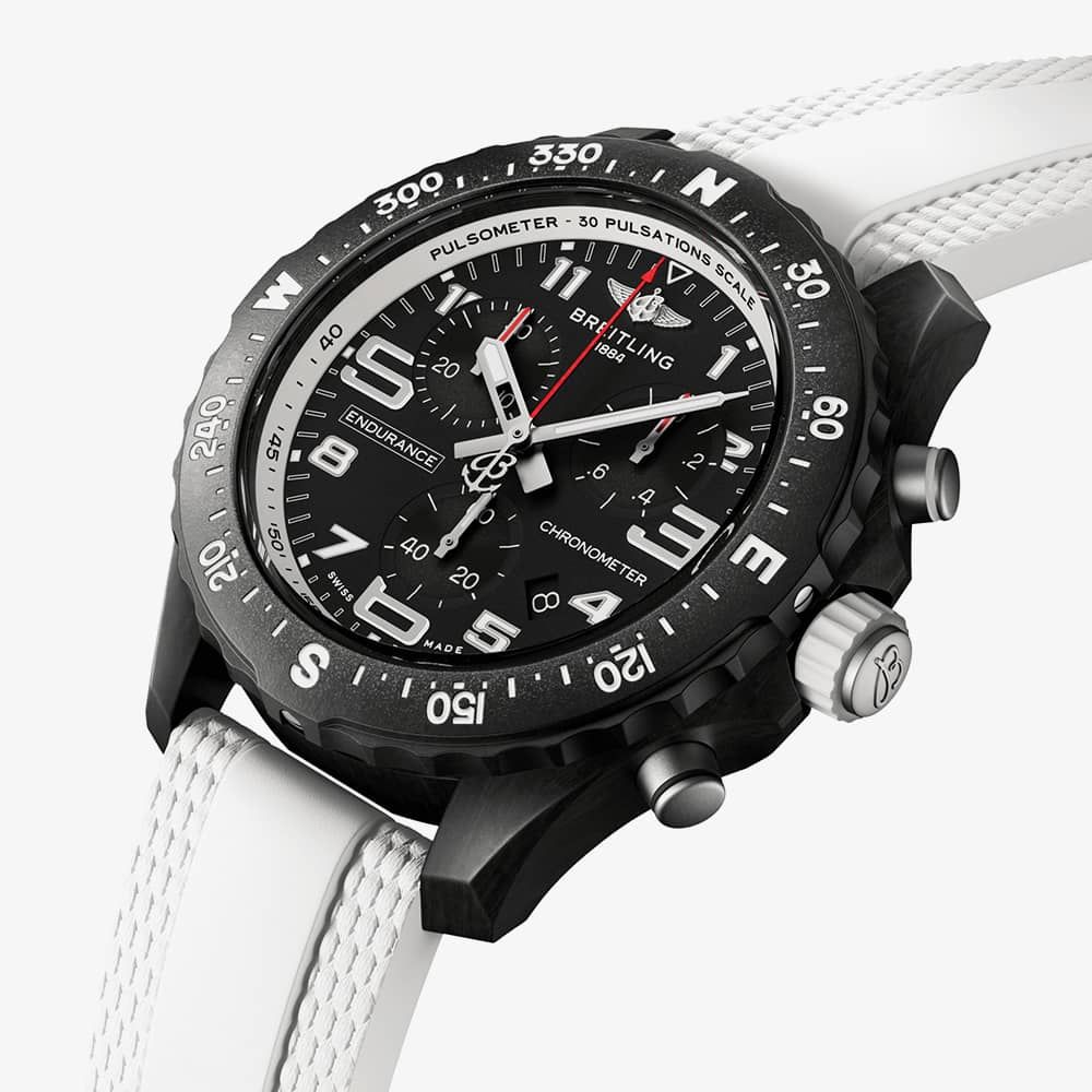 The Endurance Pro features an ultra-light Breitlight® case, a robust material 3.3 times lighter than titanium and 5.8 times lighter than stainless steel. Non-magnetic, thermally stable and hypoallergenic, Breitlight® is highly resistant to scratches, traction and corrosion. It also has a feel that is warmer than metal and a slightly textured effect, accentuating the originality of the design. Exclusive to Breitling, the material is 100-percent Swiss-made.