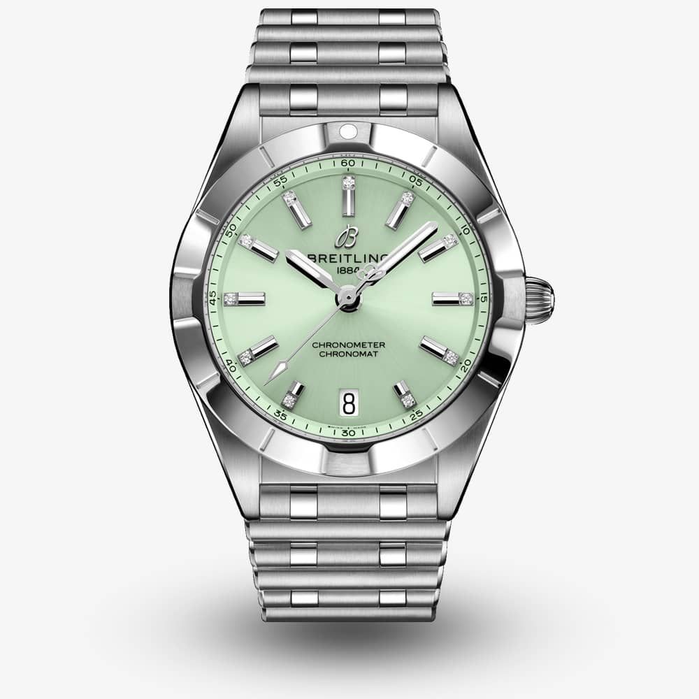 The Breitling Ladies Chronomat 32 watch is a beautiful and stunning piece for the collection. The dial features a stunning and striking green dial that gives it a stand out look. The dial also features Diamond and Baton hour markers that gives this watch its sophisticated look. This watch would stand out at its best in dress wear but would also look stunning in casual wear.