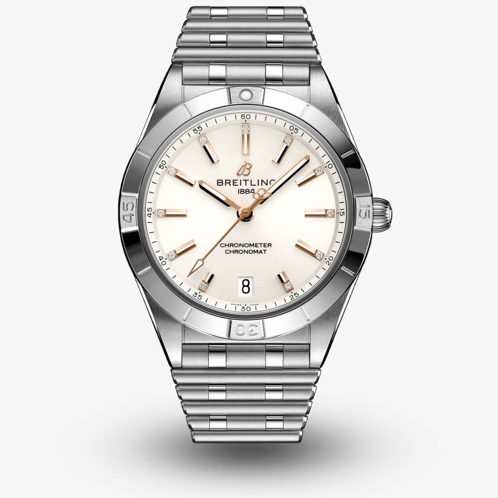 The simplistic modern-retro styling of the Chronomat Automatic 36 makes it perfect for everyday wear. It combines a 36mm stainless steel case and Rouleaux bracelet with a diamond set dial and uses a Breitling Caliber 10 COSC certified chronometer movement.