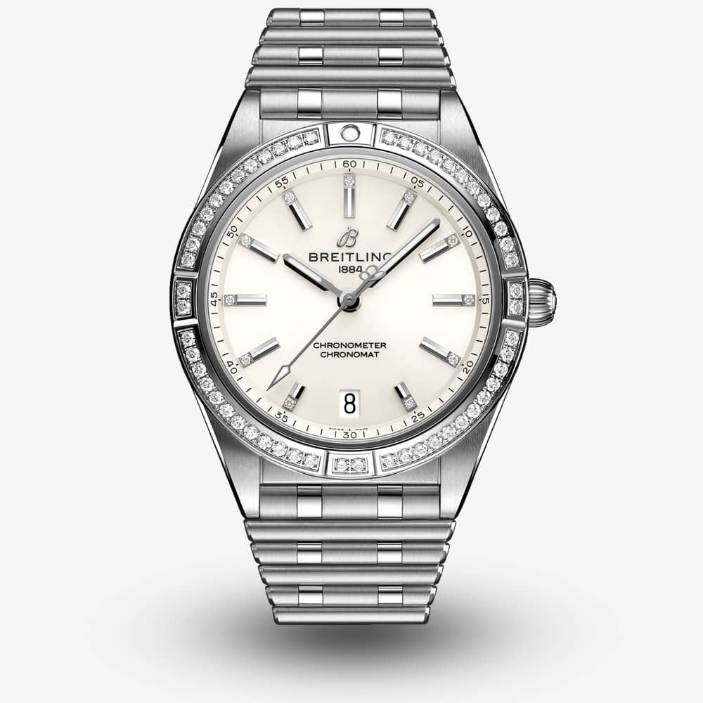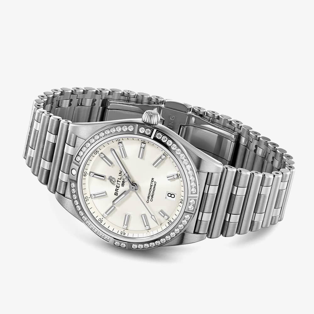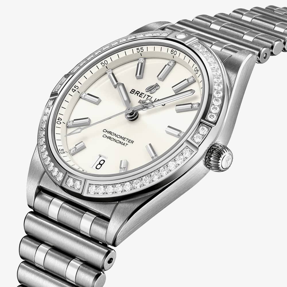 The simplistic modern-retro styling of the Chronomat Automatic 36 makes it perfect for everyday wear. It combines a 36mm stainless steel case and Rouleaux bracelet with a diamond set dial and bezel, and uses a Breitling Caliber 10 COSC certified chronometer movement.