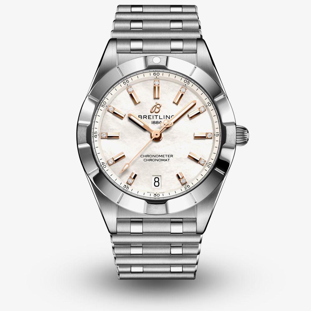 The Breitling A77310101A4A1 watch combines a 32mm round shaped stainless steel case and silver stainless steel bracelet with a fold over clasp. It has a mother of pearl analogue dial with luminescent hands, date display which is protected beneath scratch resistant sapphire crystal glass. Power is generated by the quartz movement. This model also has a water resistance of up to 100 metres.