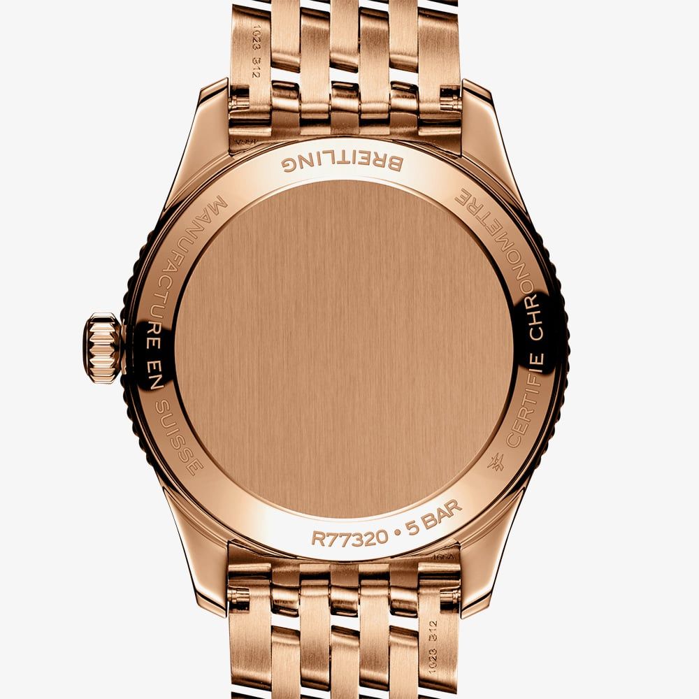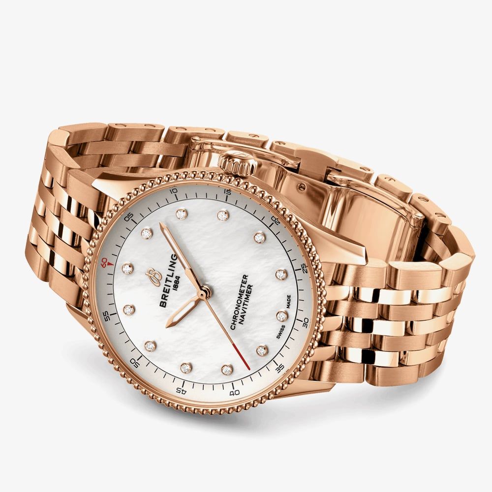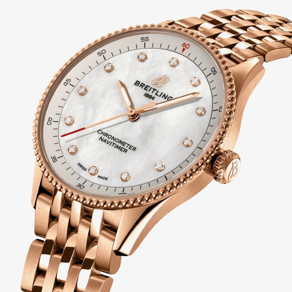 The Breitling Navitimer 32 features a stunning white mother-of-pearl dial adorned with twelve round brilliant cut lab-grown traceable diamond markers with a total carat of 0.067ct, protected beneath cambered sapphire crystal that is glare-proofed on both sides. This timepiece boasts precision with its Breitling Caliber 77 Thermocompensated SuperQuartz movement with an approximate battery life of 3-4 years.