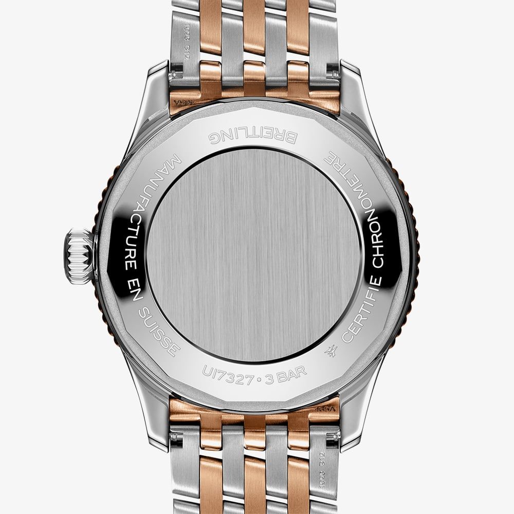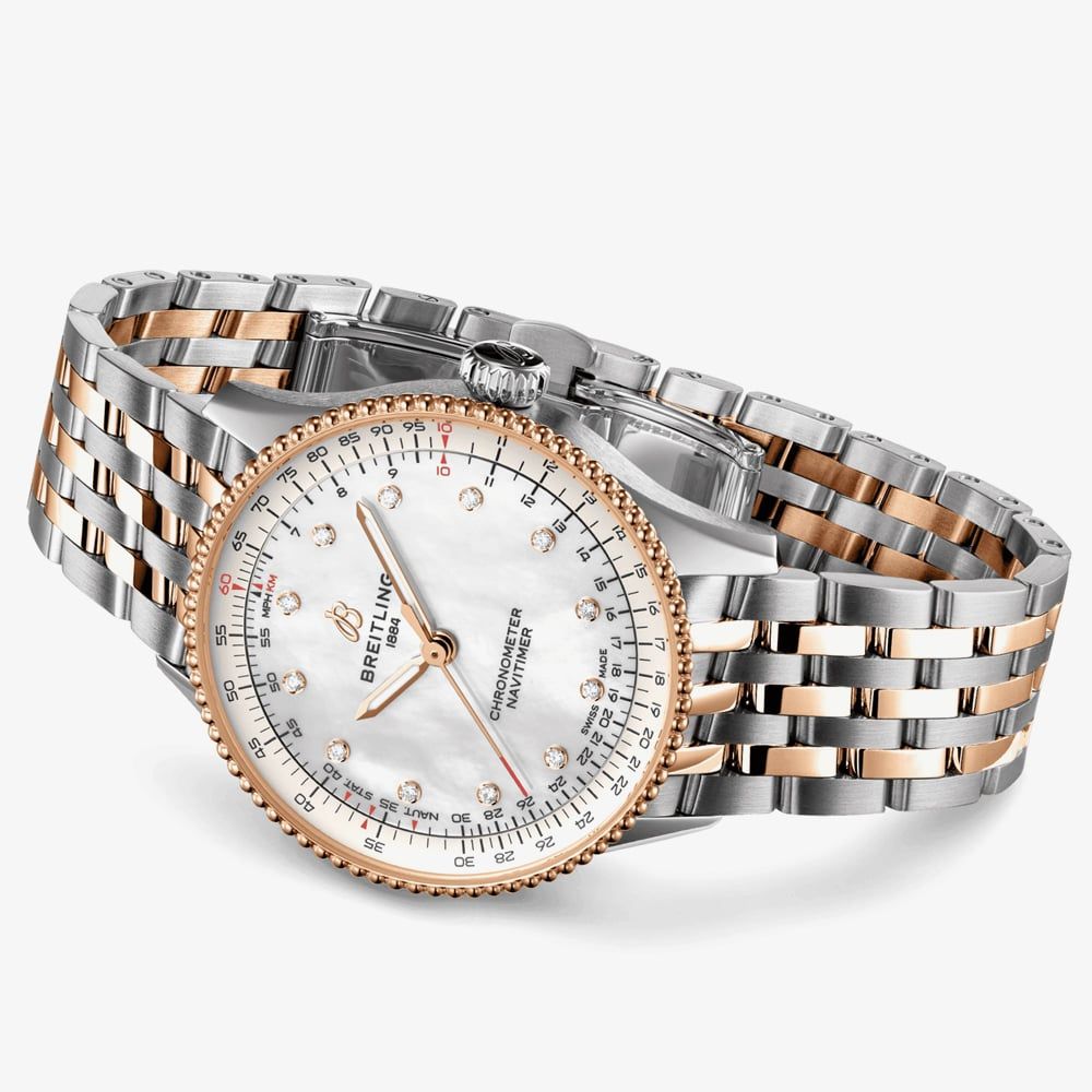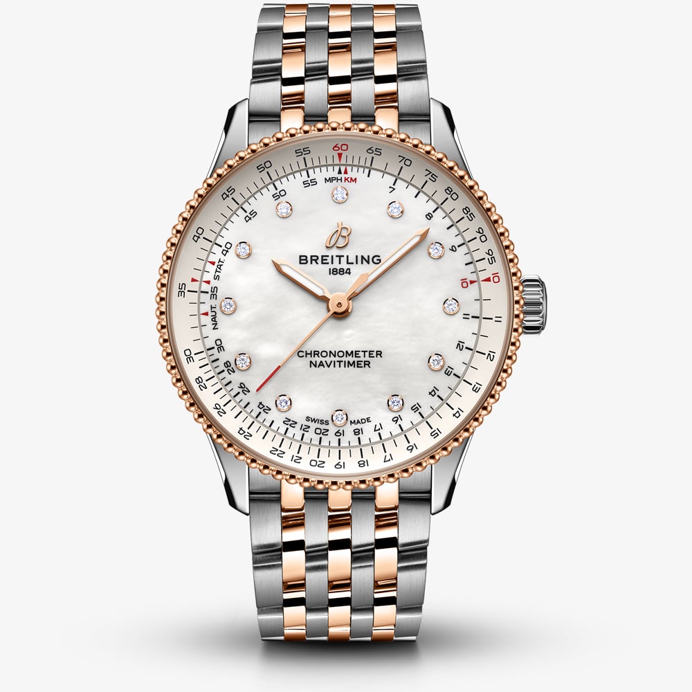 The Breitling Navitimer 36 is a stylish and functional timepiece that features a white mother-of-pearl dial, luminescent rose gold hands and indexes, a beaded 18ct rose gold bezel, and an iconic circular slide rule. The dial is protected by a cambered sapphire crystal that is glare-proofed on both sides, ensuring clear visibility in all lighting conditions. The watch is powered by the Breitling Caliber 17 automatic movement, with a power reserve of 38 hours.