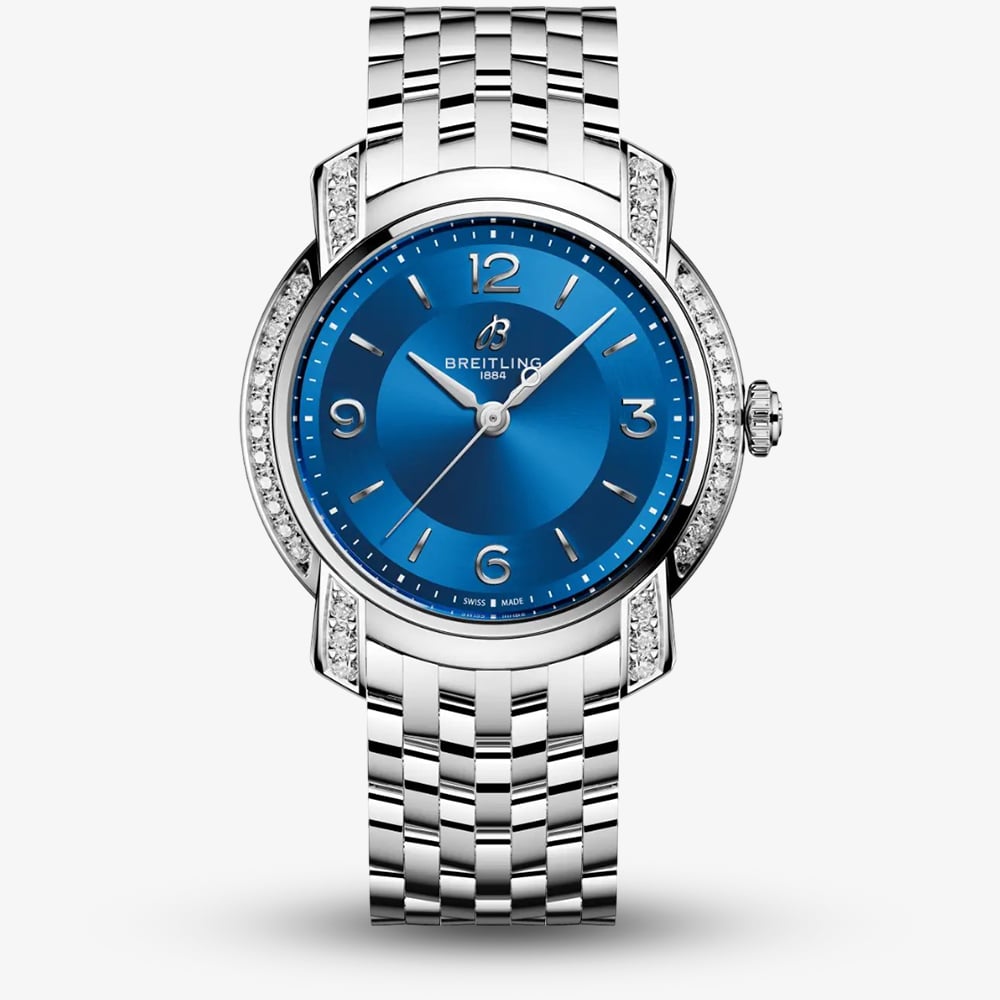 The Breitling Lady Premier A77330671C1A1 brings a graceful balance of jewellery like beauty and refined watchmaking, echoing the elegance first envisioned by Willy Breitling and inspired by his wife Beatrice. The 32mm stainless steel case has a smooth sculptural profile that rests lightly on the wrist, its polished surfaces catching the light with gentle warmth. A cascade of diamonds encircles the blue dial, drawing attention to the minimalist numerals and delicately shaped lozenge hands that give the piece its poised character.
