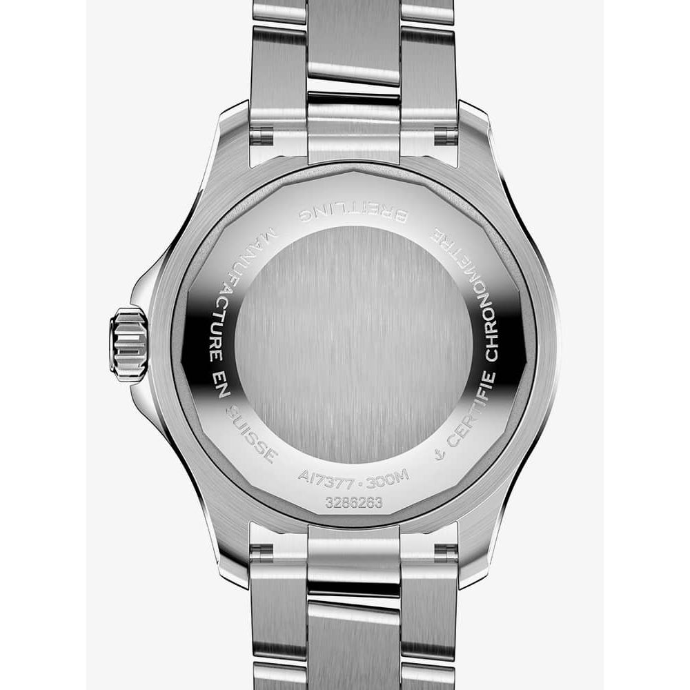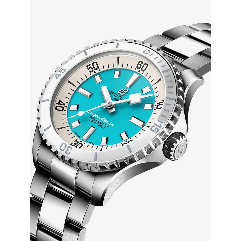 The Breitling Ladies Superocean 36mm Blue Dial Watch A17377211C1A1 watch combines a 36mm round shaped stainless steel case and silver stainless steel bracelet with a fold over clasp. It has a Blue analogue dial with Super-LumiNova coated hands which is protected beneath anti-reflective coated scratch resistant sapphire crystal glass. Power is generated by the automatic movement with a 38 hour power reserve. Watch is also shock, sand and saltwater-resistant. This model also has a water resistance of up to 300 metres.