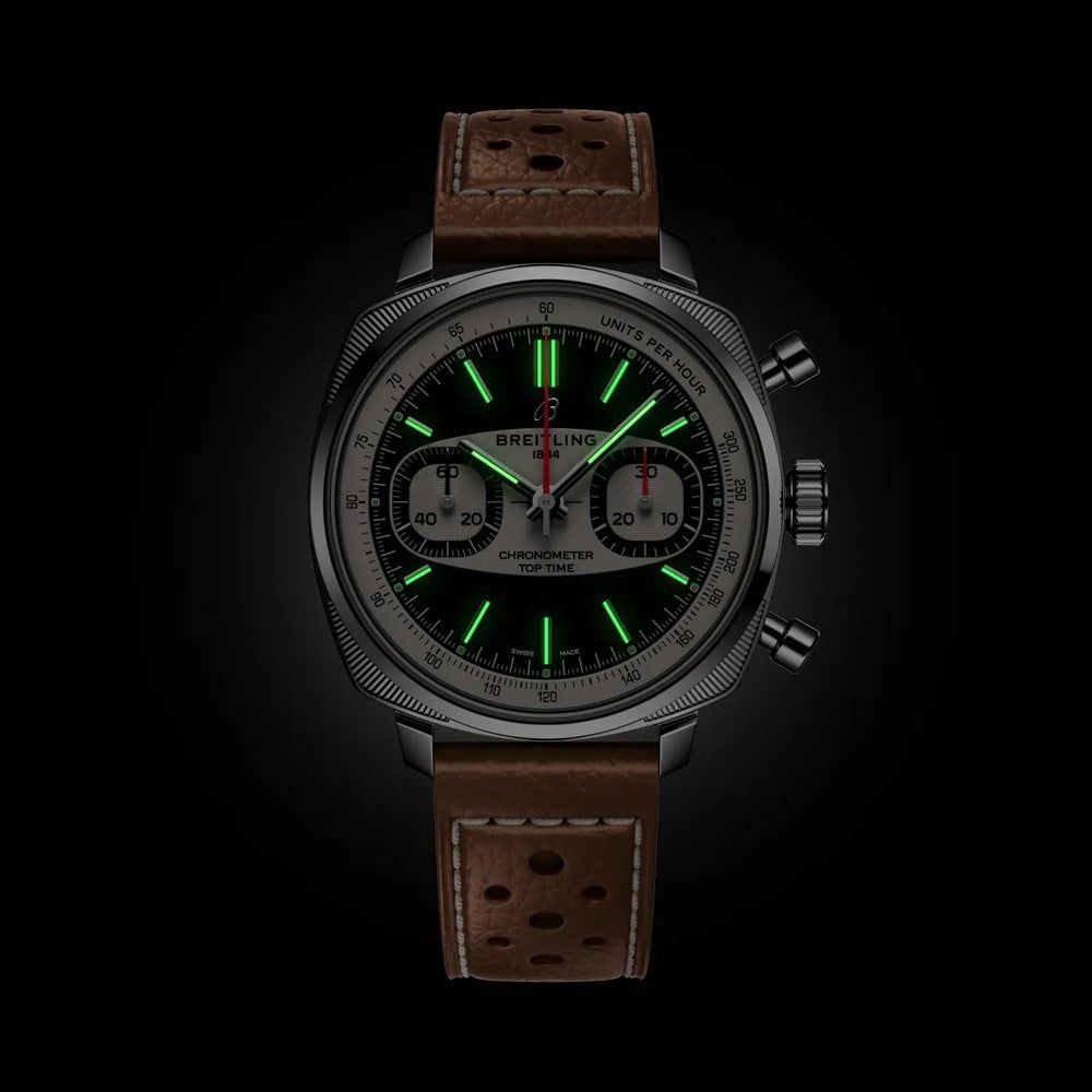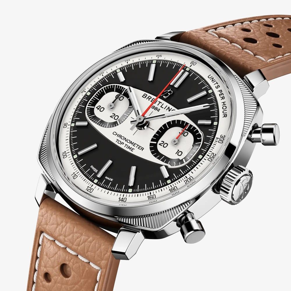 The Top Time Racing is inspired by the iconic Top Time designs of the 1960s. Its stainless steel chronometer case, cushion-shaped design, bold tachymeter scale, and unique “squircle” sub dials capture the essence of high-speed racing and the split-second decisions made on the track. At the centre of the dial is the signature “surfboard” motif—an elliptical design drawn from the Top Time archives, influenced by classic car dashboards. The watch is complemented by a beige leather strap, adding a timeless touch to its racing heritage.
