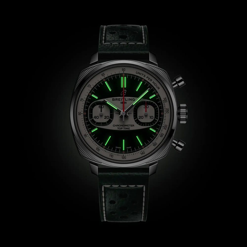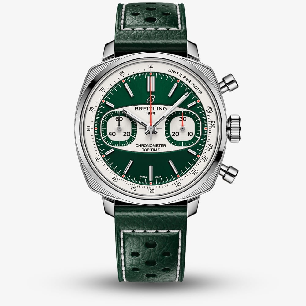 The Top Time Racing draws inspiration from the bold Top Time designs of the 1960s. Featuring a stainless steel chronometer case, a cushion-shaped design, a striking tachymeter scale, and distinctive “squircle” sub dials, it captures the essence of high-speed racing and the quick decisions made on the track. At the centre of the dial is the iconic “surfboard” motif—an elliptical design rooted in the Top Time archives, influenced by the aesthetics of classic car dashboards. The watch is completed with a green leather strap, adding a modern yet classic touch to its racing heritage.