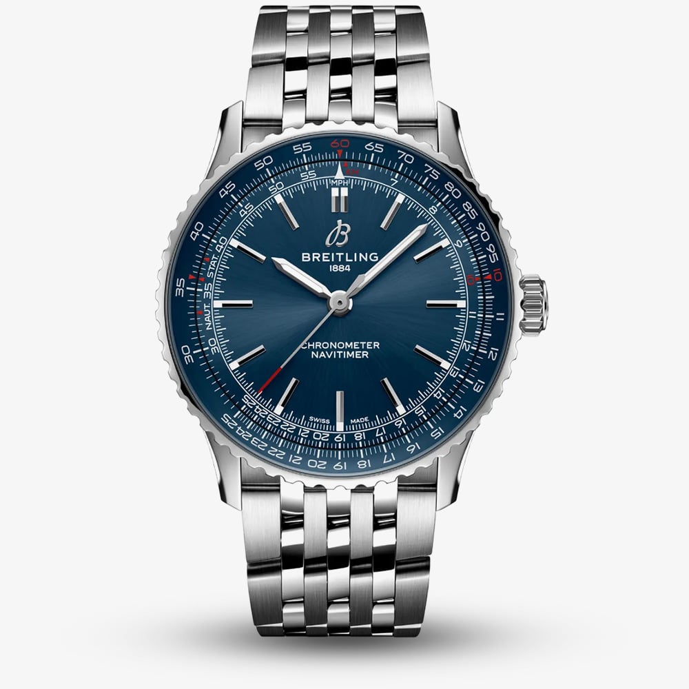 The Breitling Navitimer Automatic 41 elevates an icon of aviation heritage with refined sophistication. Its rich blue dial, encircled by the signature circular slide rule, radiates clarity and depth, while a 41 mm stainless steel case with polished and brushed finishes plays elegantly with the light. At its heart, a chronometer-certified automatic movement ensures uncompromising precision, uniting technical mastery with timeless style. A contemporary expression of Breitling’s most legendary design, this Navitimer embodies both luxury and performance.